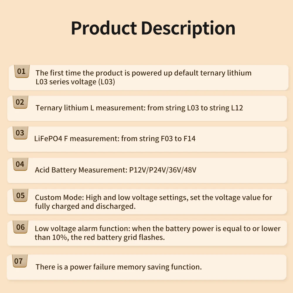 1.Pantalla LED de energía en tiempo real, clara de un vistazo: esta placa indicadora de energía adopta una pantalla LED de alto brillo, que puede mostrar de forma clara e intuitiva el voltaje y la capacidad restante de la batería.