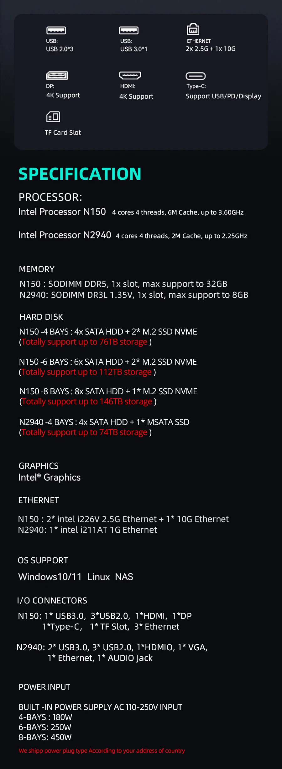 El modelo N150 N100 tiene HDD de 4 compartimentos, 6 bahías y 8 bahías de 2,5 o 3,5 pulgadas, cada bahía admite un máximo de 18 TB, utiliza RAM SODIMM DDR5 y SSD M.2 NVMe de uso interno;