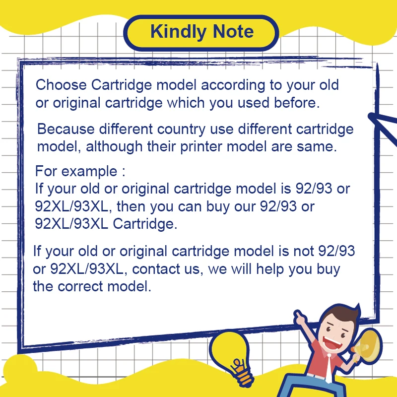Si el modelo de su cartucho de tinta no es 92 93 o 92/93XL, contáctenos y le ayudaremos a comprar el modelo correcto.