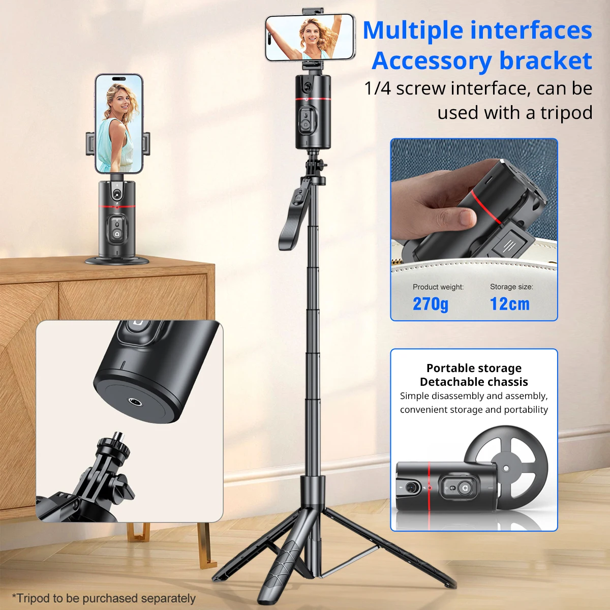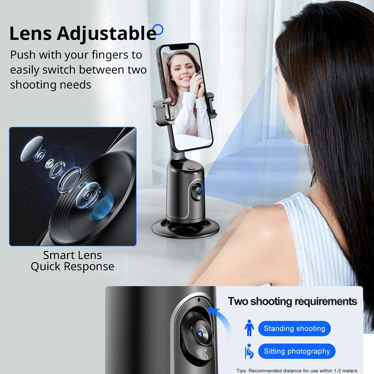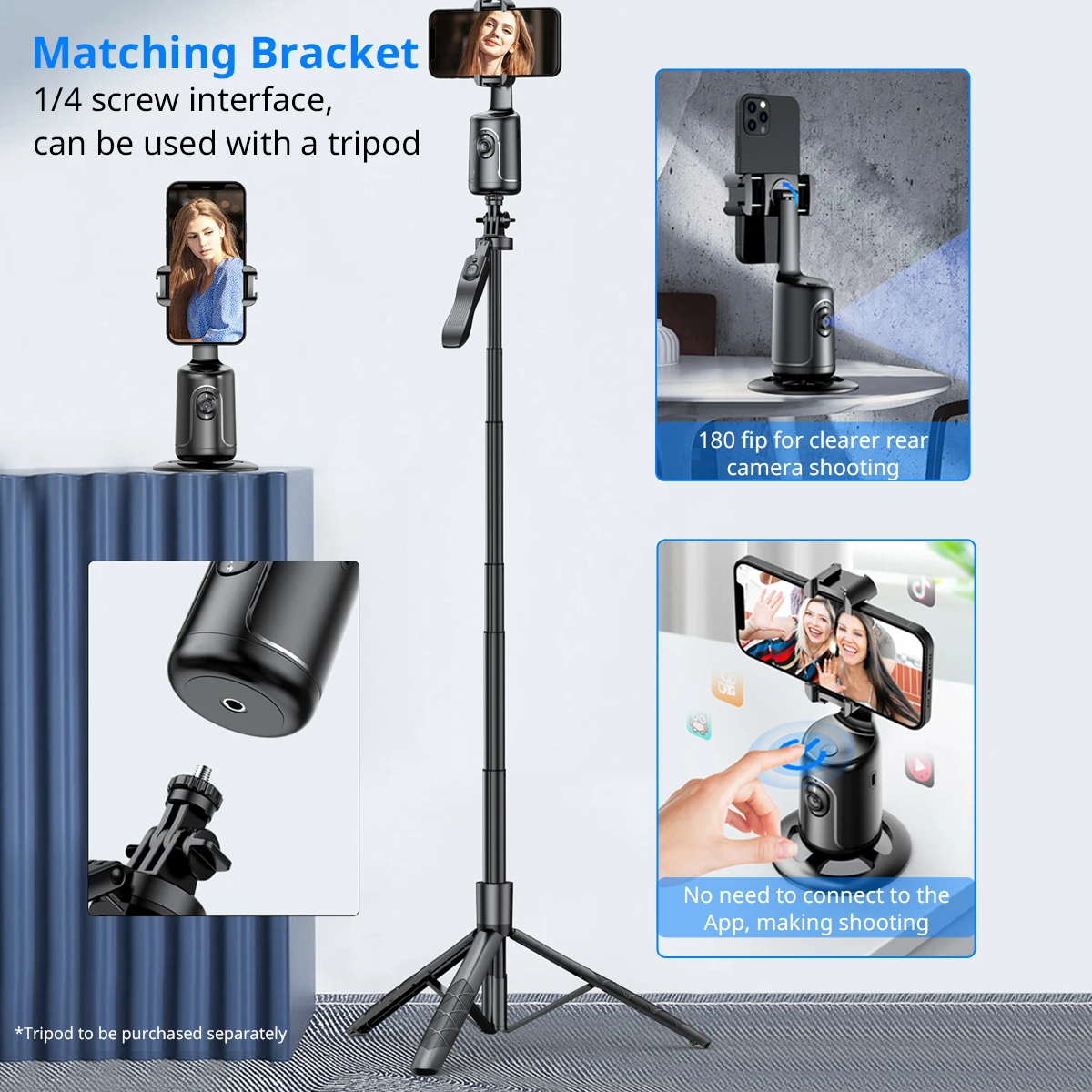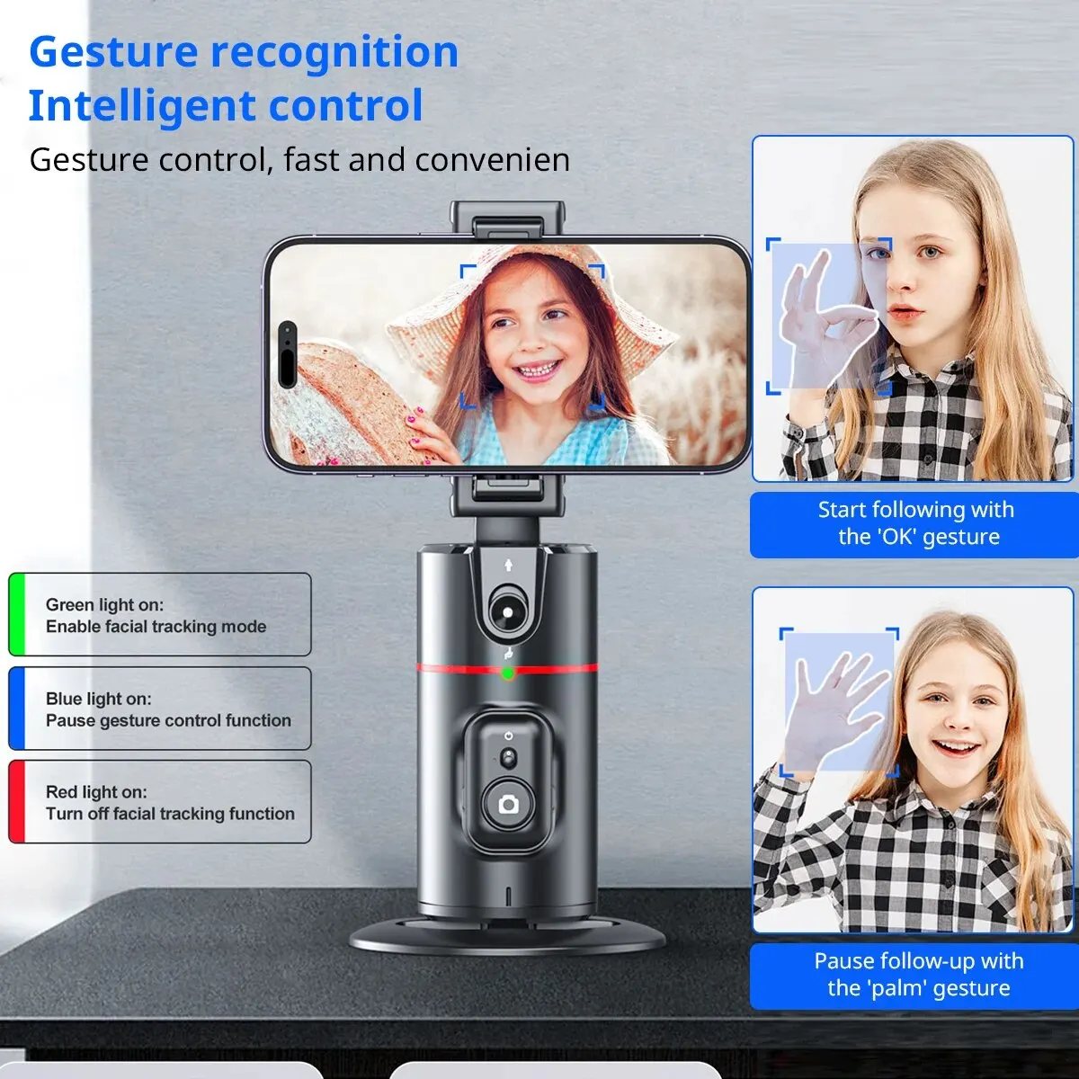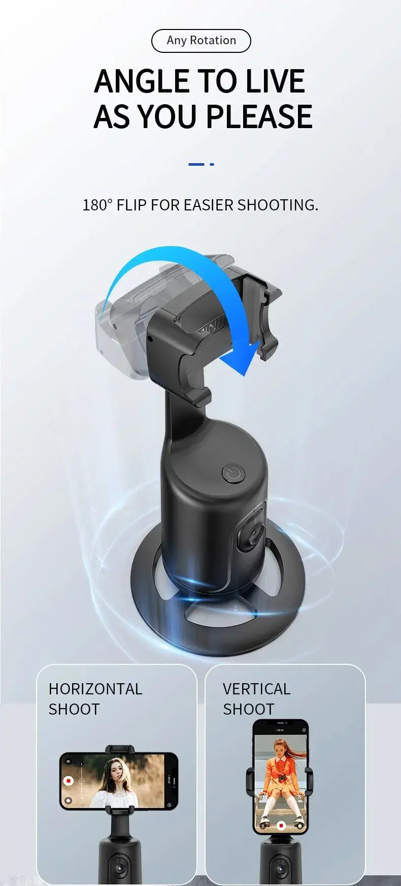 【Face Tracking AND Intelligent Shooting】Este soporte para teléfono de seguimiento facial adopta el sistema informático AI que puede reconocer y rastrear automáticamente su cara o cuerpo, 360 ° rotar de manera constante con su movimiento. Libera tus manos para videollamadas y transmisión en vivo.