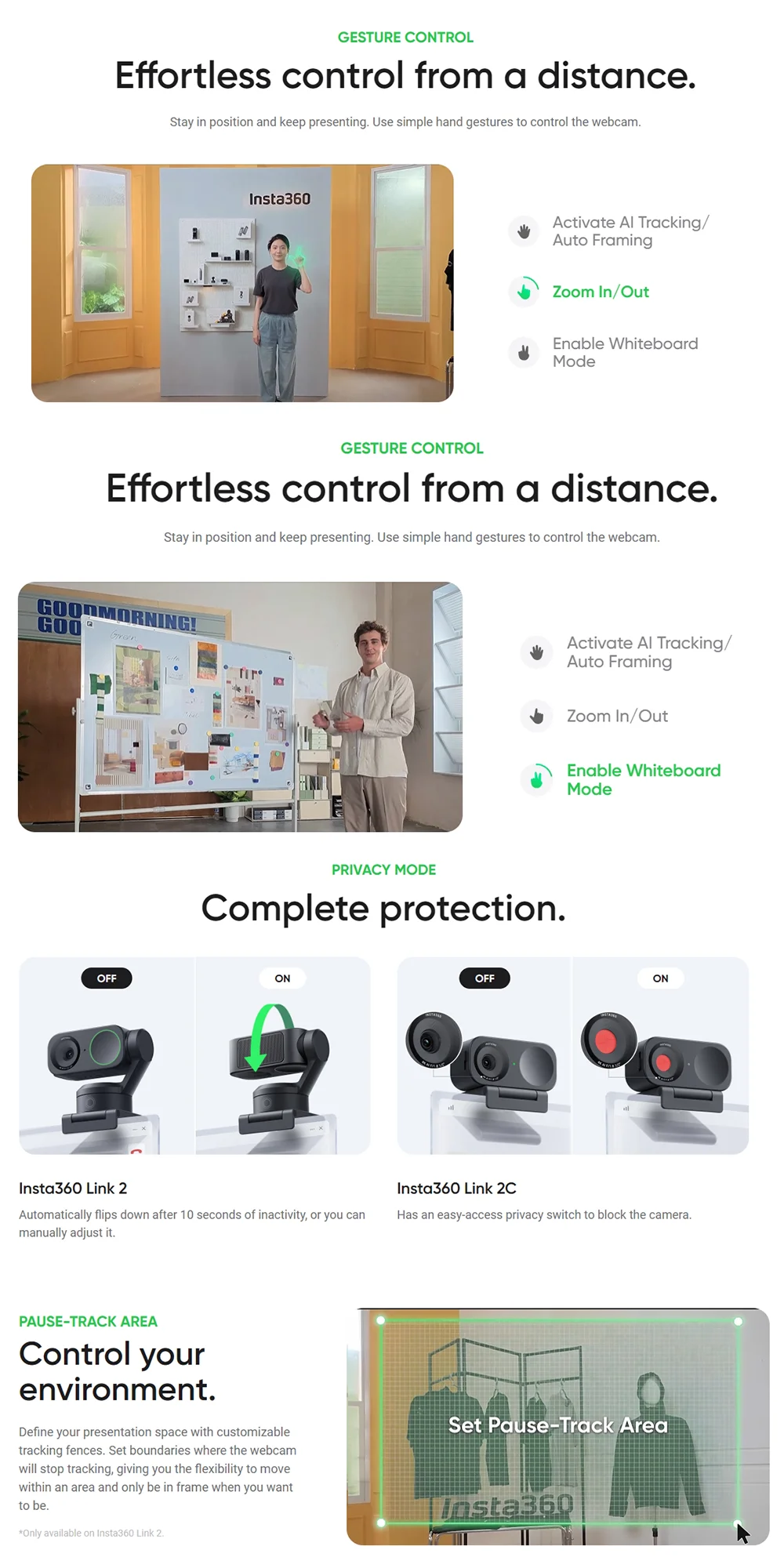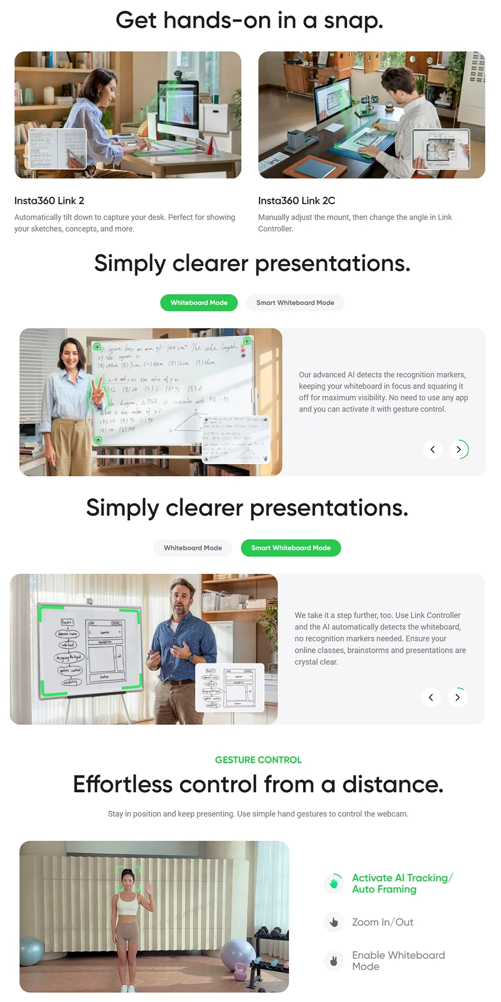 Control remoto por gestos y teléfonos inteligentes: controle su cámara web de forma remota desde su teléfono inteligente o use gestos simples con las manos para iniciar el seguimiento AI/marcamiento automático, acercar o alejar y activar el modo de pizarra blanca.