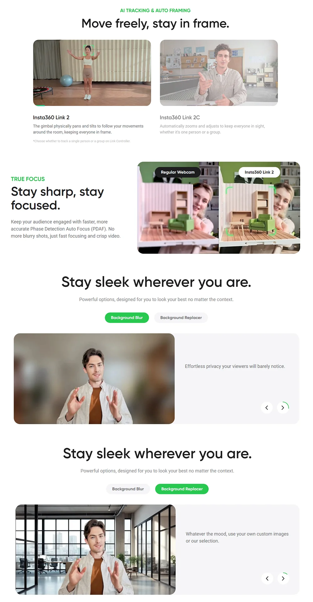 Enmarcado automático: Insta360 Link 2C amplía y se ajusta automáticamente para mantener todos claramente a la vista, ya sea una persona o un grupo.