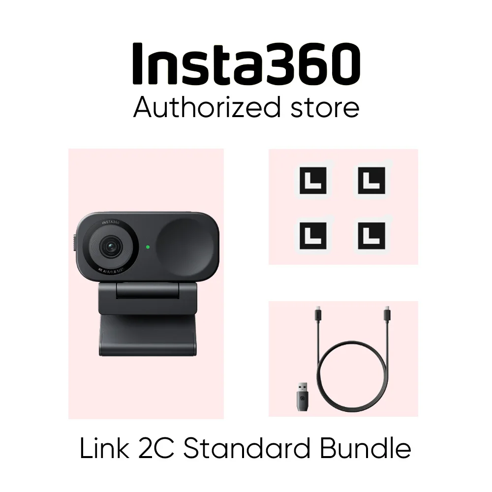 El paquete estándar incluye 1x Insta360 Link 2C, 1x soporte magnético, 4x marcadores de reconocimiento, 1x cable USB-C y 1x adaptador USB-C a USB-A.