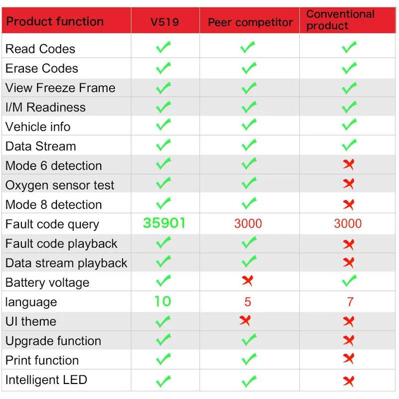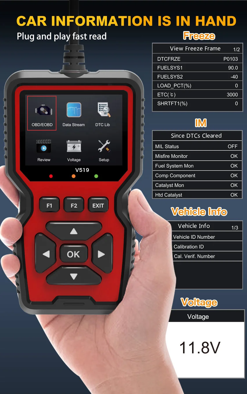 • Instrumento automotriz de la diagnosis de falta V519:Este producto es una herramienta de diagnóstico avanzada que puede ayudar a identificar y corregir fallas en el motor de su automóvil.