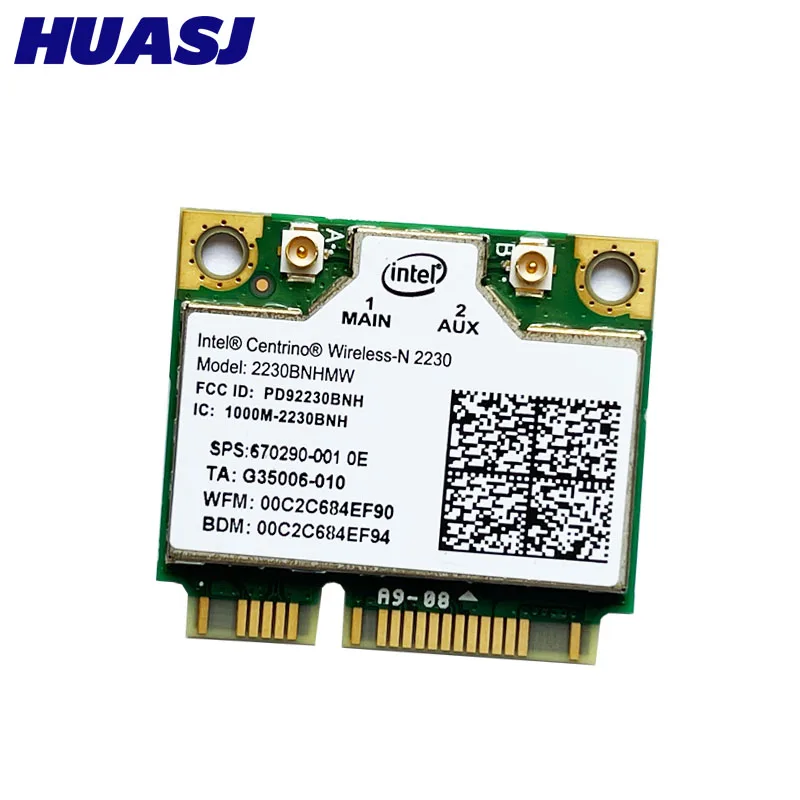 Descripción: Marca: Intel Modelo: 2230BNHMW Velocidad de hasta 300Mbps Soporte 802.11b/G/n Con Bluetooth 4,0 Estado: bien probado, buen estado. Características: Número de pieza: wireless-n 2230 Velocidad de transmisión: 300Mbps Protocolo inalámbrico (s): 802.11b, 802,11g, 802.11n, Bluetooth v4.0 Producto inalámbrico + tarjeta combinada Bluetooth, inalámbrico + tarjeta combinada BlueTooth No es compatible con portátiles IBM/HP Compatible con: Dell/Sony/ACER/ISUS/MSI/Clevo/Terransforce/haseeetclaptopscon ranura PCie Mini (No incluya lenovo y HP, si se puede usar después de reescribir la lista blanca). Nota: ¡El chipest es Intel y la marca es fvi! Paquete: 1 * tarjeta inalámbrica 2 * tornillos