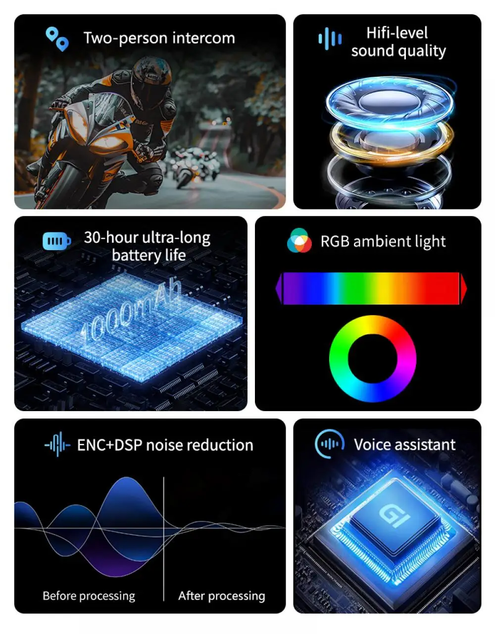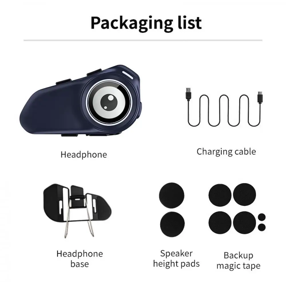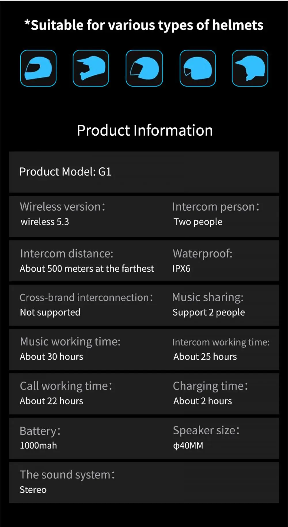 Versión inalámbrica: Bluetooth5.3 Persona de intercomunicación: 2 Distancia del intercomunicador: aproximadamente 500 m como máximo Nivel de impermeabilidad: IPX6 Compartir música: admite 2 personas Tiempo de trabajo de música: aproximadamente 30 horas Tiempo de trabajo del intercomunicador: aproximadamente 25 horas Tiempo de trabajo de llamada: aproximadamente 22 horas Tiempo de carga: 2 horas Capacidad de la batería: 1000 mAh Sistema de sonido: Estéreo