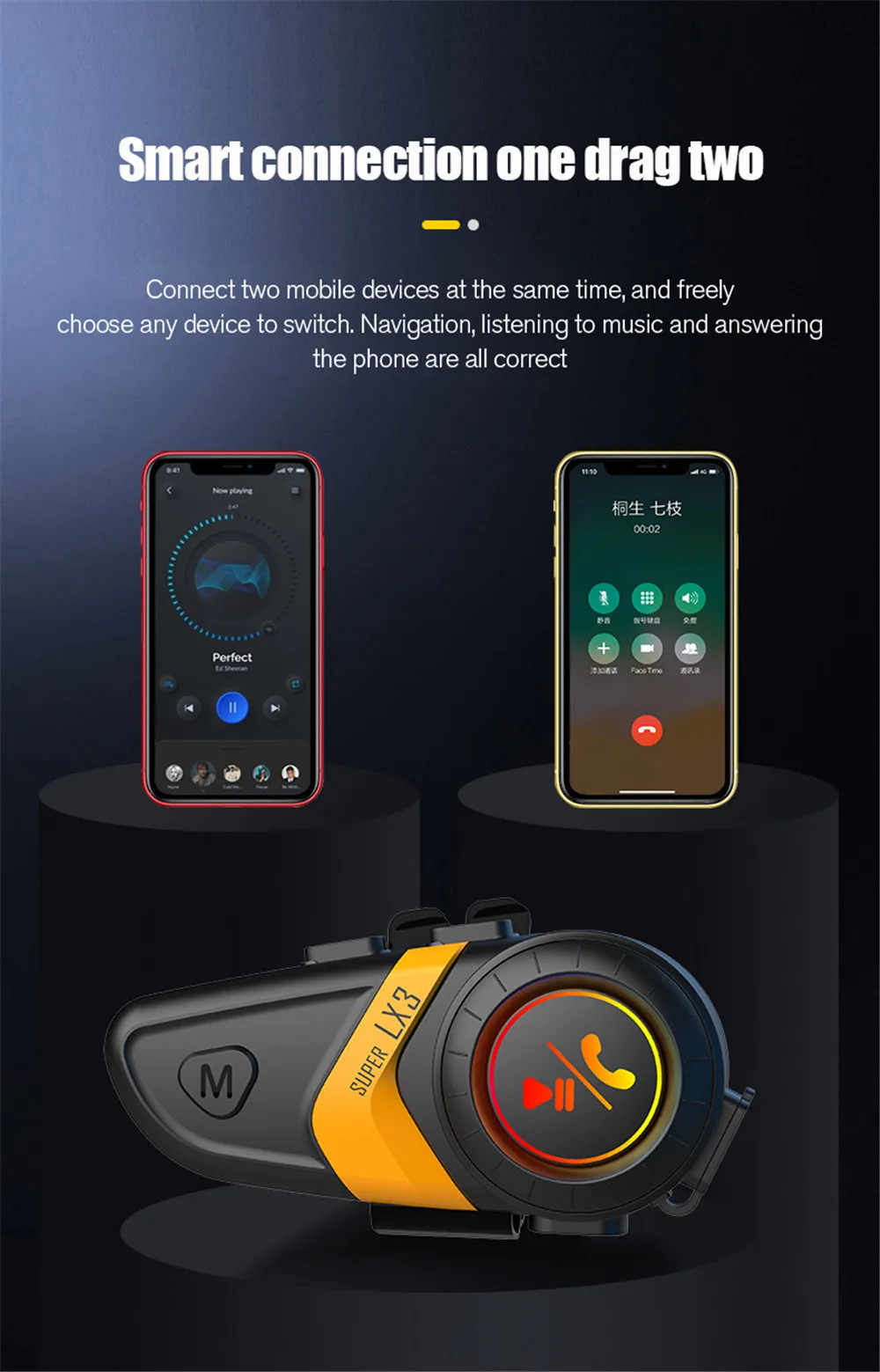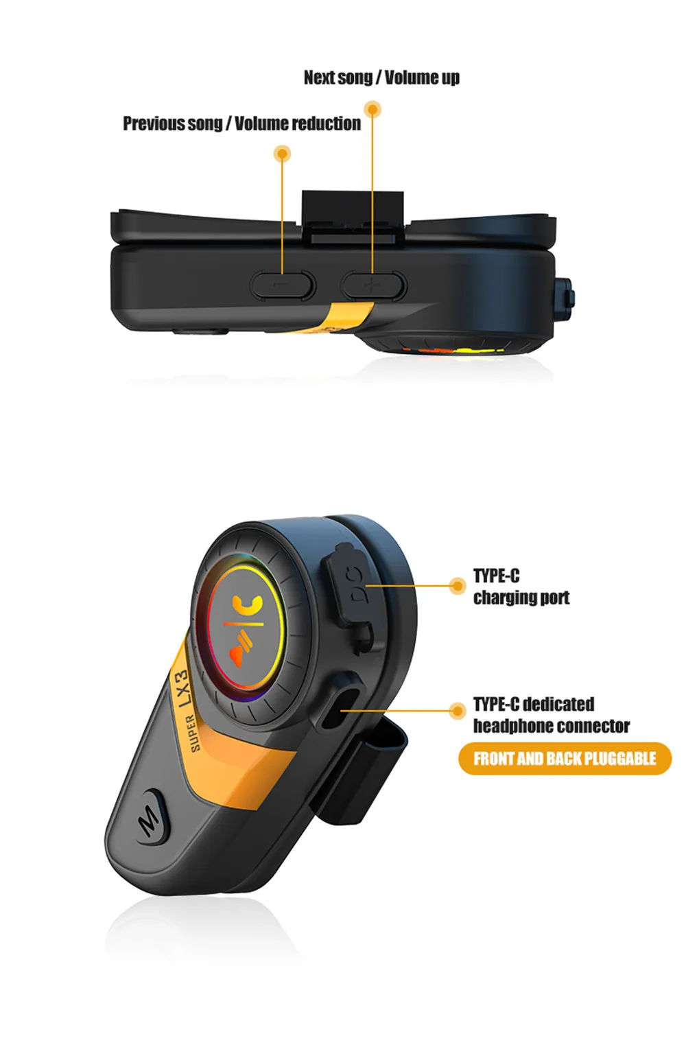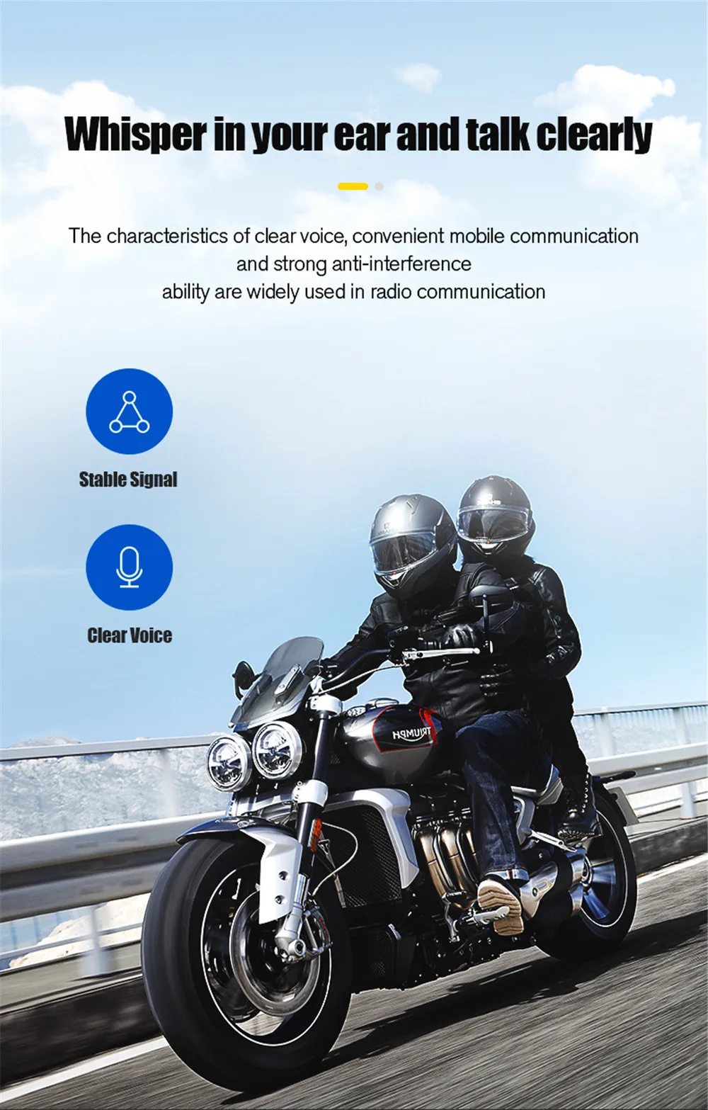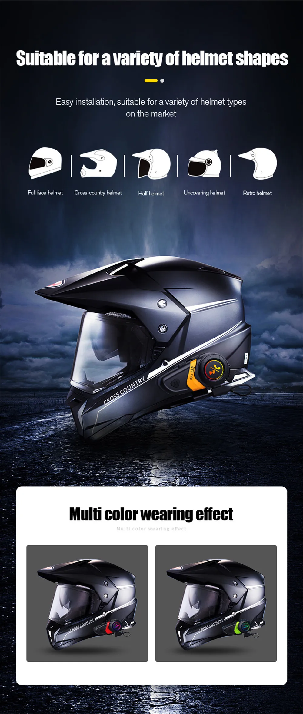 Amplia aplicabilidad:* El conjunto de micrófono suave es adecuado para casco integral, casco de rally.* El juego de micrófono duro es adecuado para casco de media cara, casco revelador, casco retro.Características:-Operación precisaCon la función de Aviso de voz, podría ayudarle a lograr operaciones más precisas, reducir errores y comunicarse más rápidamente.-Voz claraLa propagación de la banda U es relativamente estable y la banda de frecuencia es más ancha, y la capacidad antiinterferencia es fuerte, lo que le brinda una experiencia de conversación clara.-Fácil de usarEste producto adopta un diseño de botón de presión física para garantizar que pueda percibir claramente el funcionamiento del botón mientras usa guantes para evitar el uso indebido.-ImpermeableUtilizando una tecnología impermeable bien diseñada, el nivel impermeable de este auricular ha alcanzado IPX6 sin temor al viento y la lluvia.Especificaciones:Tipo: Intercomunicador Bluetooth para motocicleta
