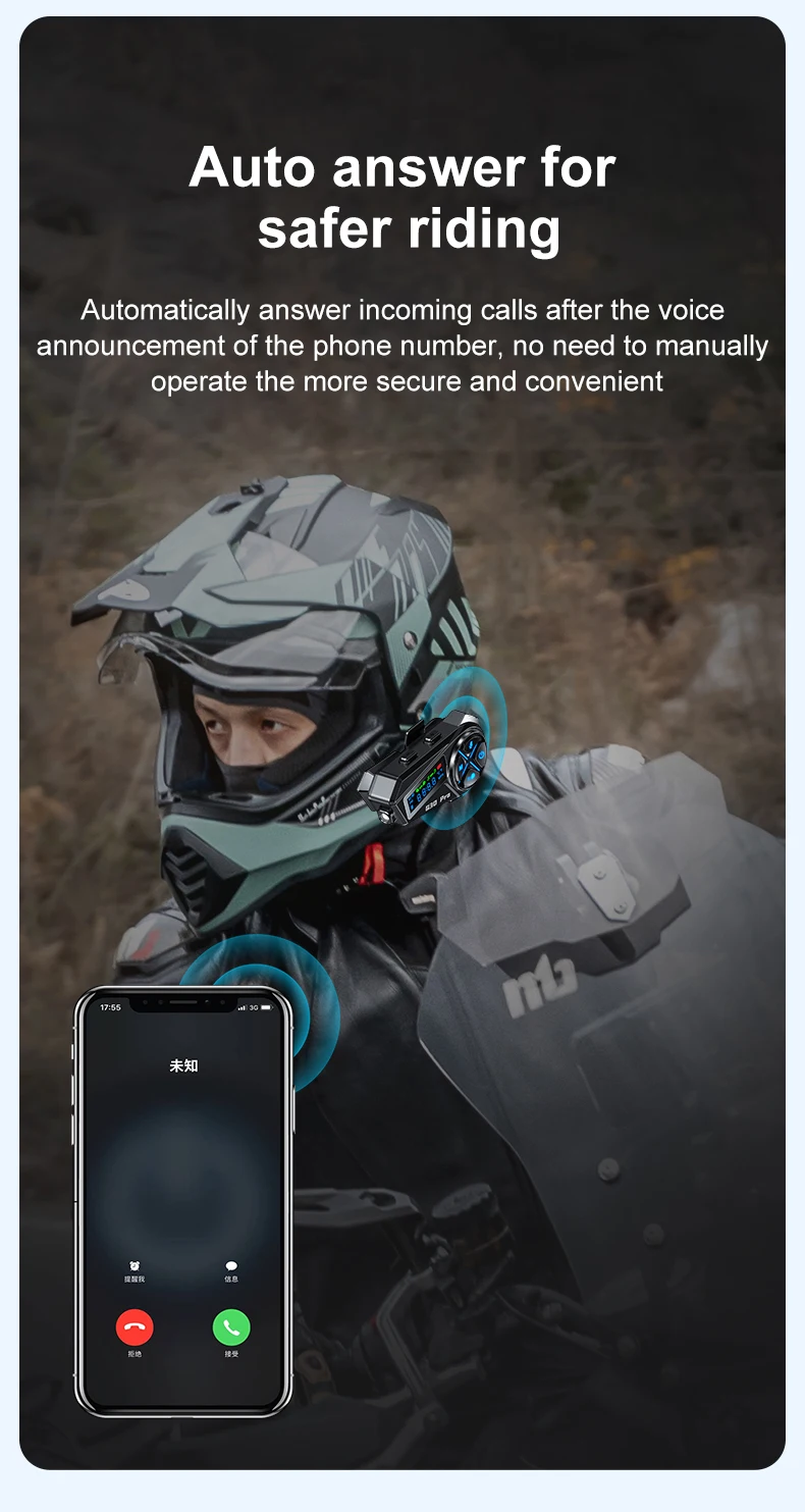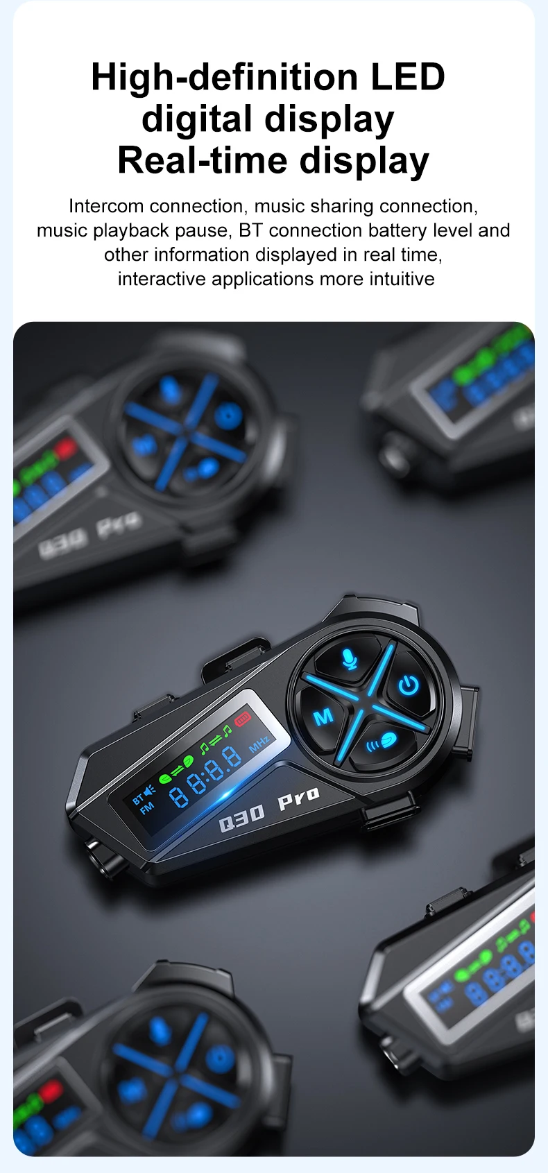 Bluetooth 5.4 | Interfono de 500 metros | Iluminación de linterna | Pantalla LED en tiempo real | Compartir música | Radio FM | Gran capacidad de 1000 mA | Calidad de sonido HiFi