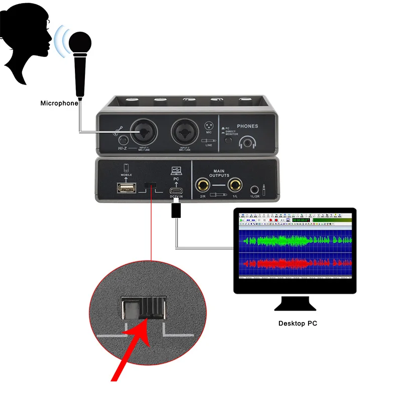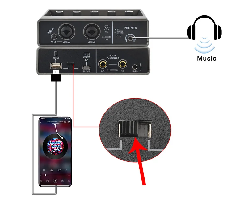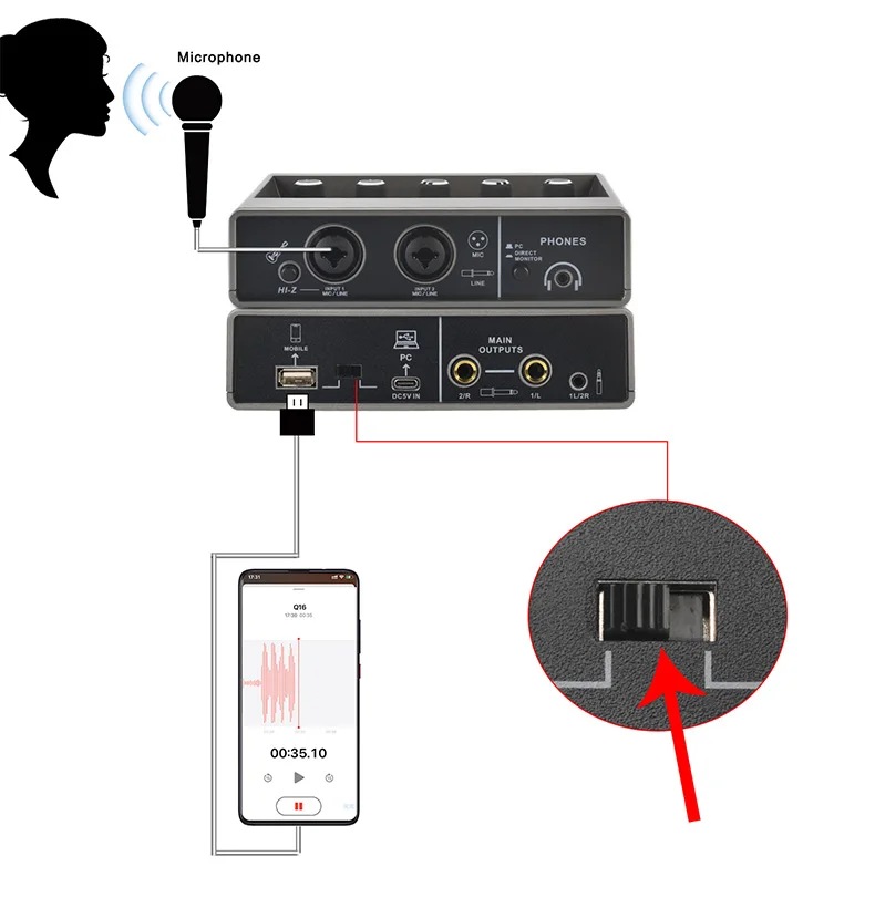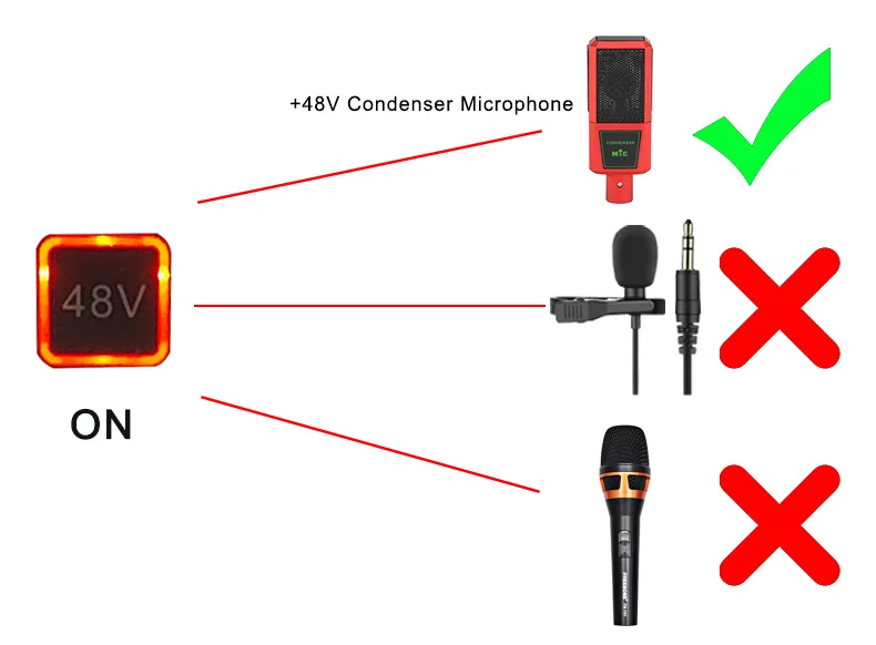Si su micrófono es un micrófono de condensador de + 48V, conéctelo al mezclador a través del cable XLR y encienda la alimentación fantasma de + 48V.