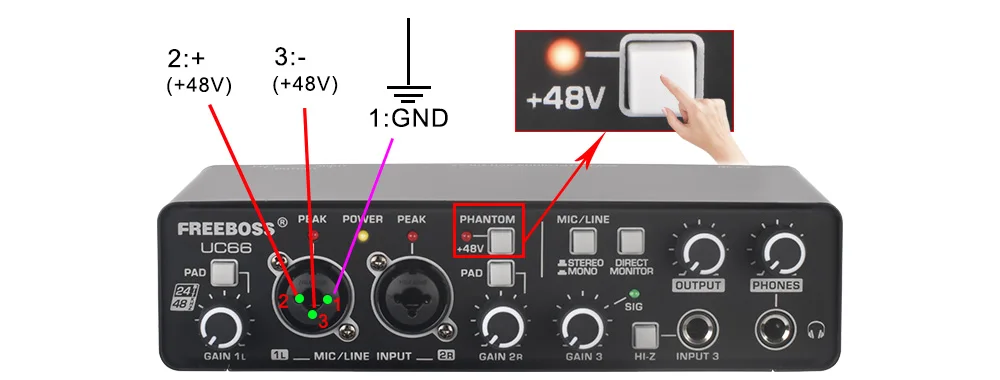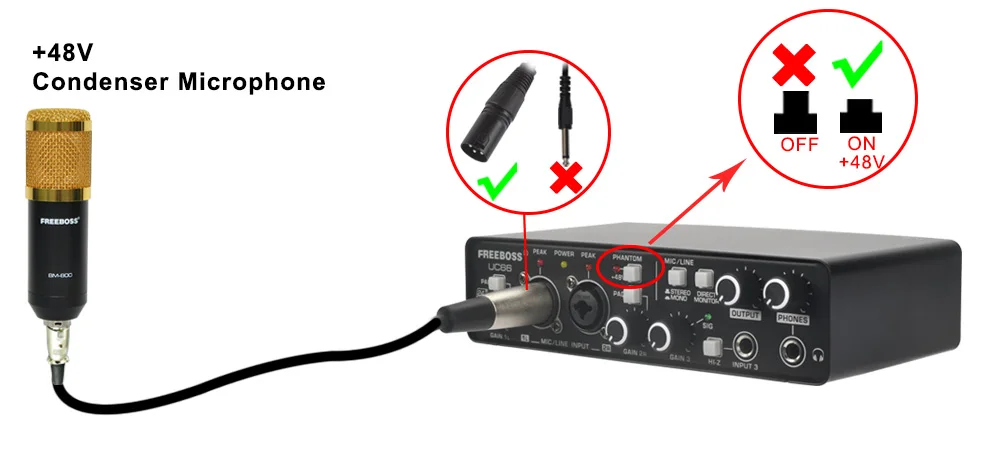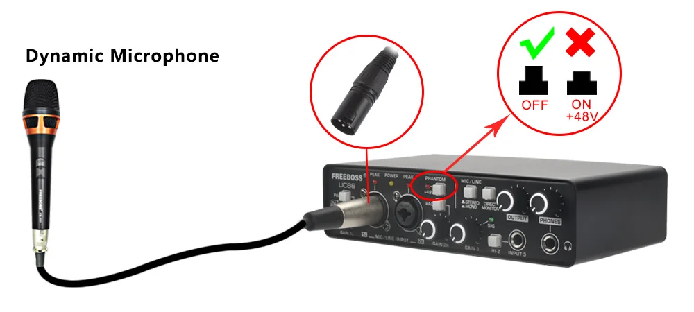 Si su micrófono es un micrófono de condensador de 48 V, utilice un conector XLR para conectarlo a la tarjeta de sonido y encienda la alimentación fantasma de 48 V; de lo contrario, el micrófono de condensador de 48 V no funcionará en la tarjeta de sonido.