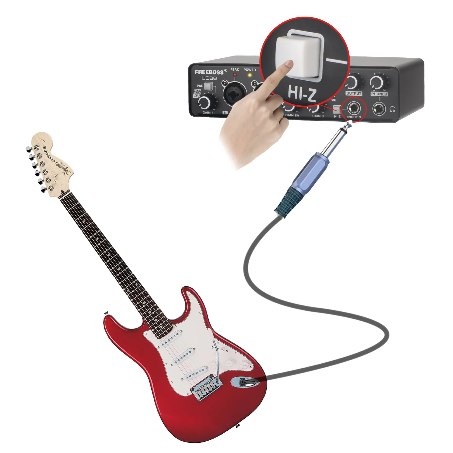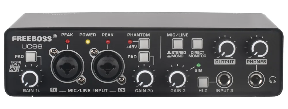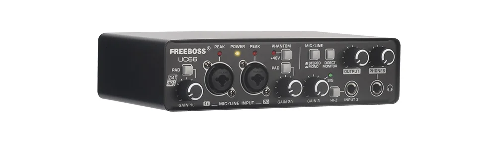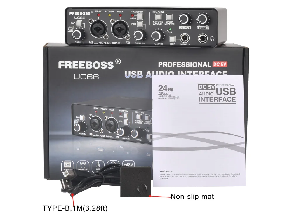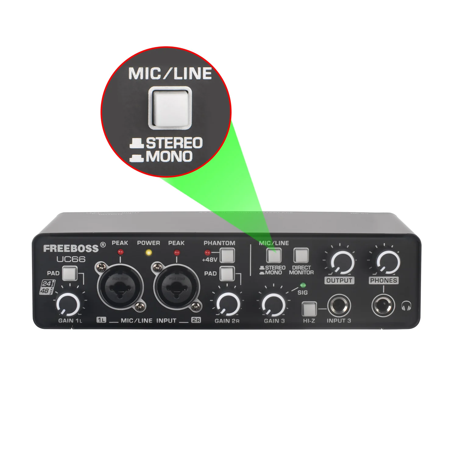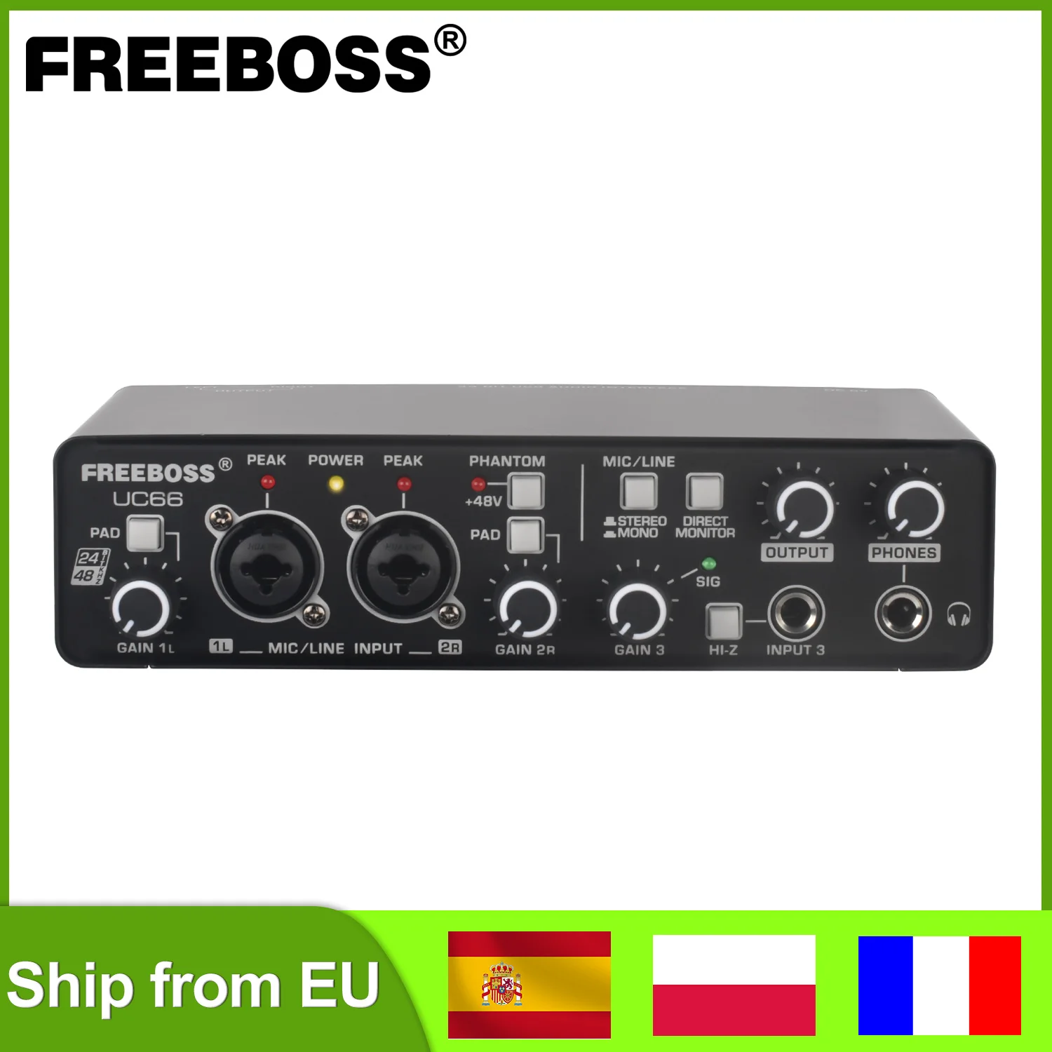 Comprar Interfaz de Audio de guitarra FREEBOSS, 24 bits, 48KHz, 2 entradas de micrófono, tarjeta de sonido externa con Mono estéreo DIR para grabación de ordenador UC66