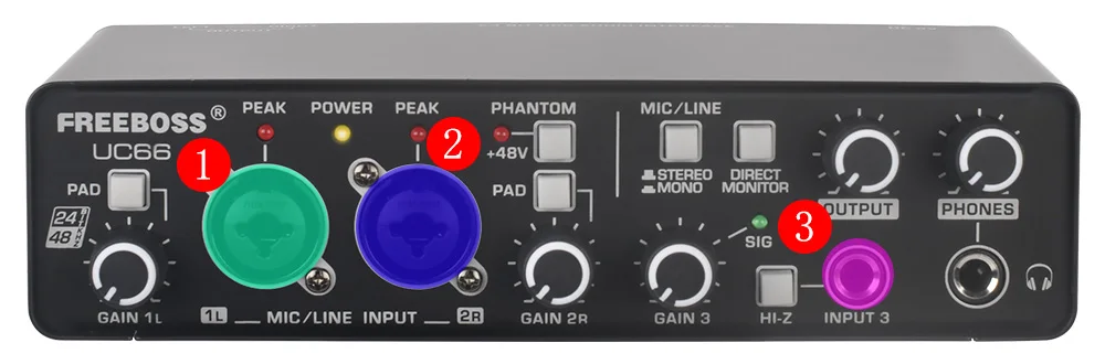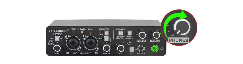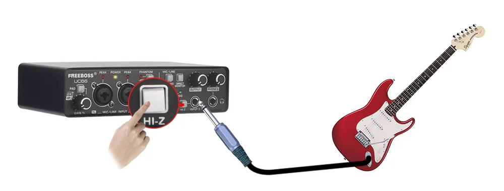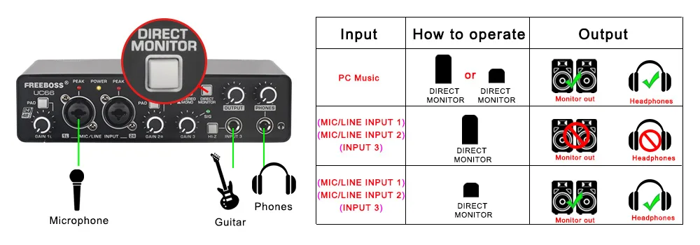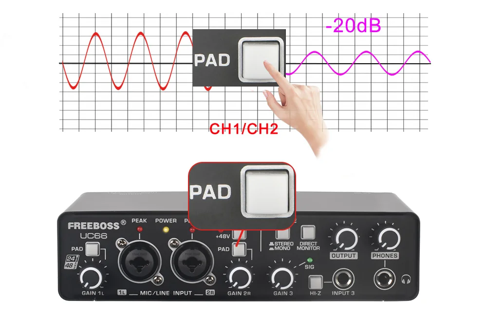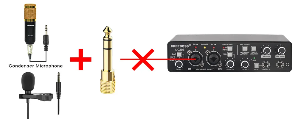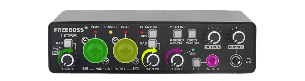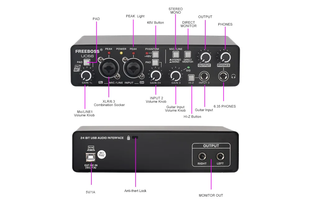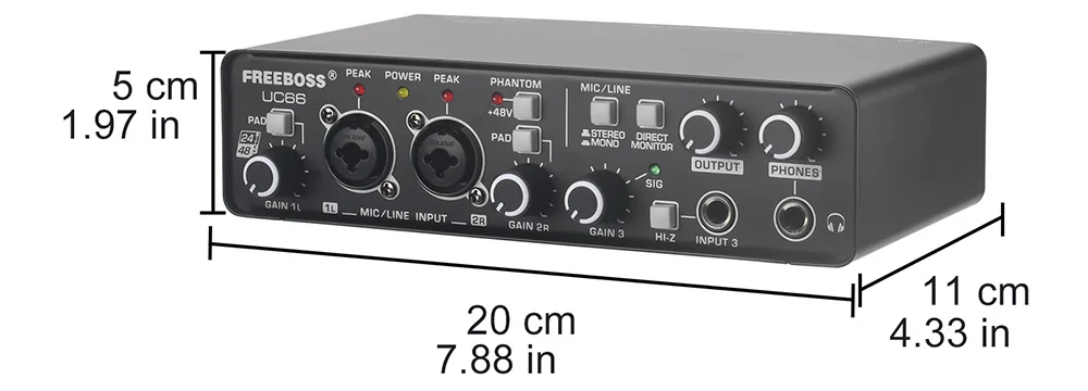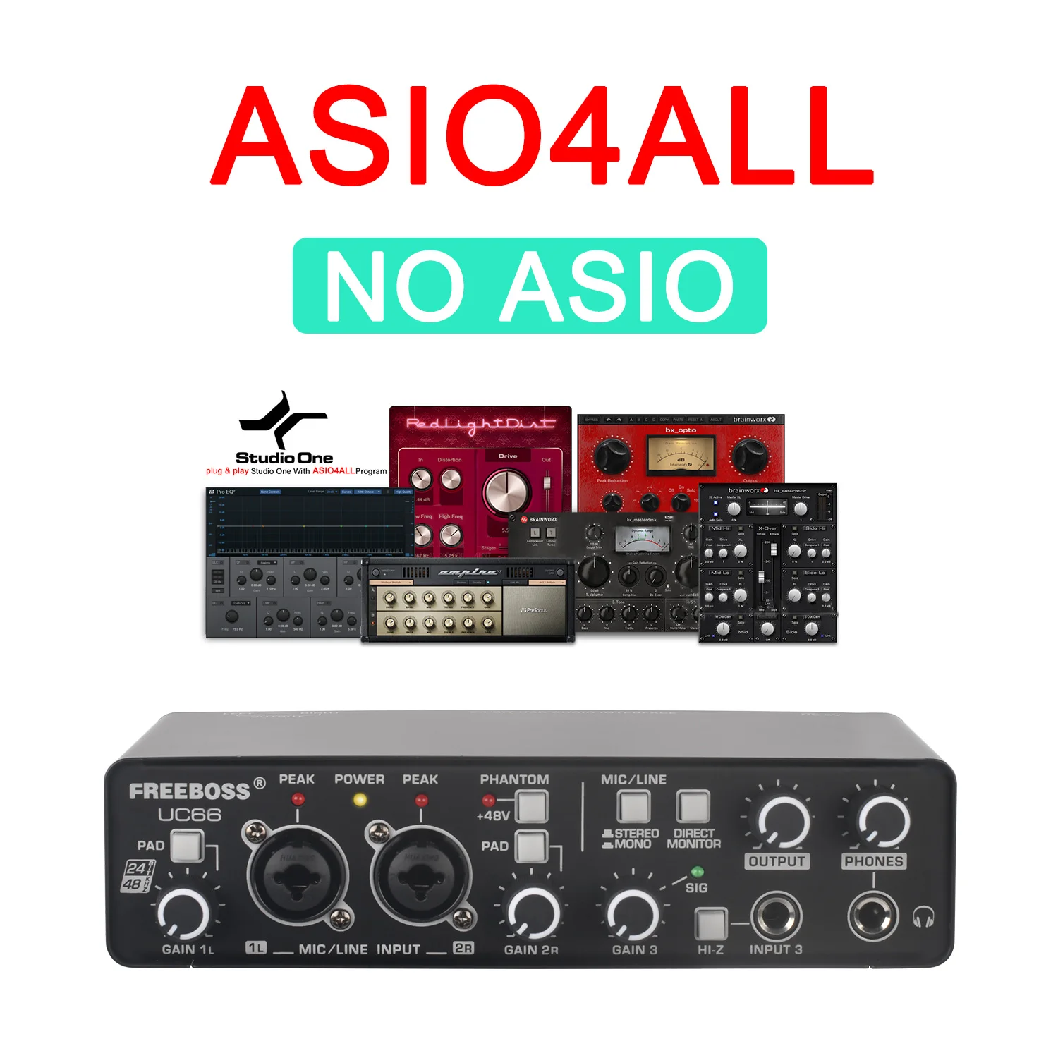 Comprar Interfaz de Audio de guitarra FREEBOSS, 24 bits, 48KHz, 2 entradas de micrófono, tarjeta de sonido externa con Mono estéreo DIR para grabación de ordenador UC66