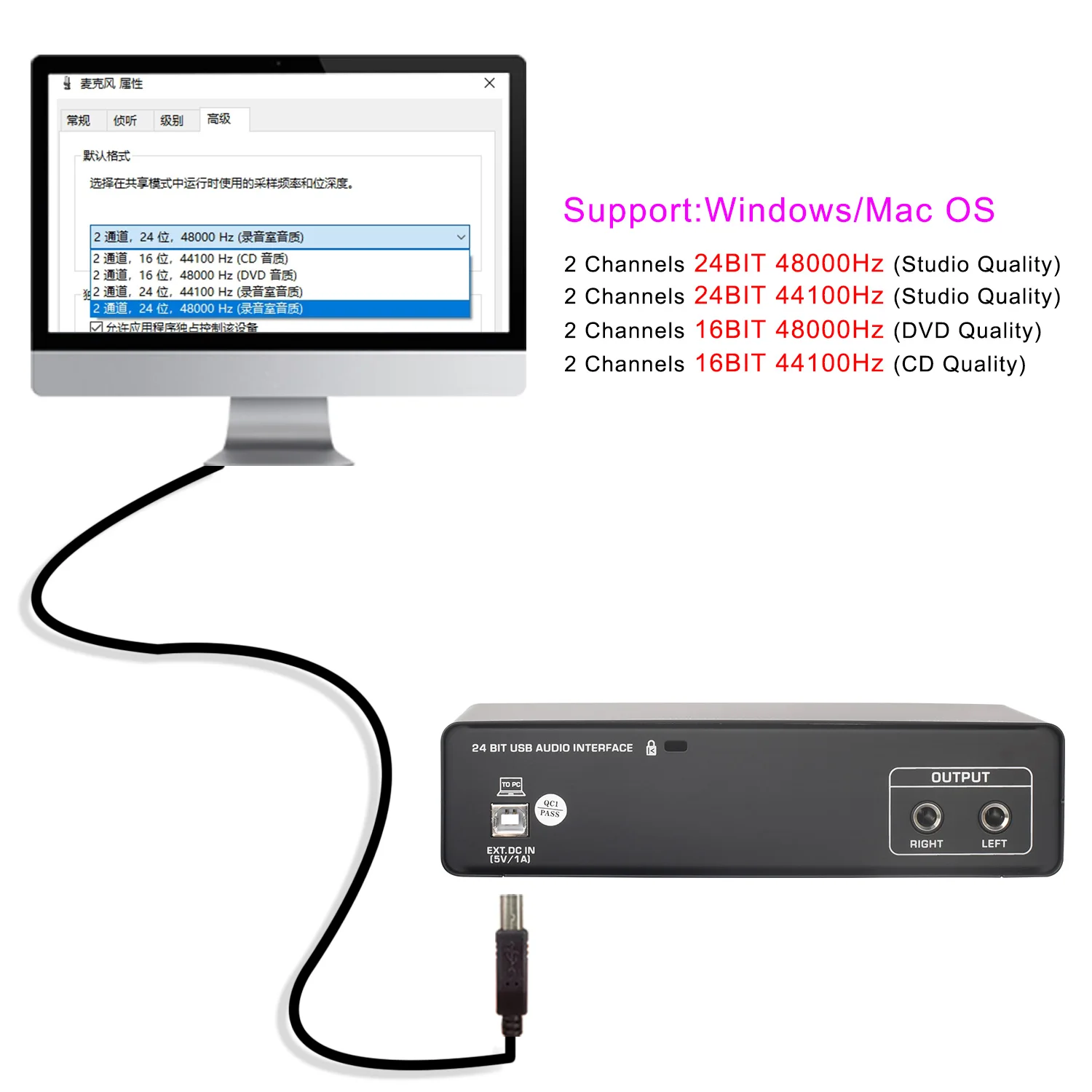Interfaz de audio de entrada de 3 canales de 24 bits y 48 KHz compatible con tarjeta de sonido externa ASIO4ALL GoldWave con interruptor mono estéreo y botón PAD de monitor directo para sistema Windnows Mac OS.