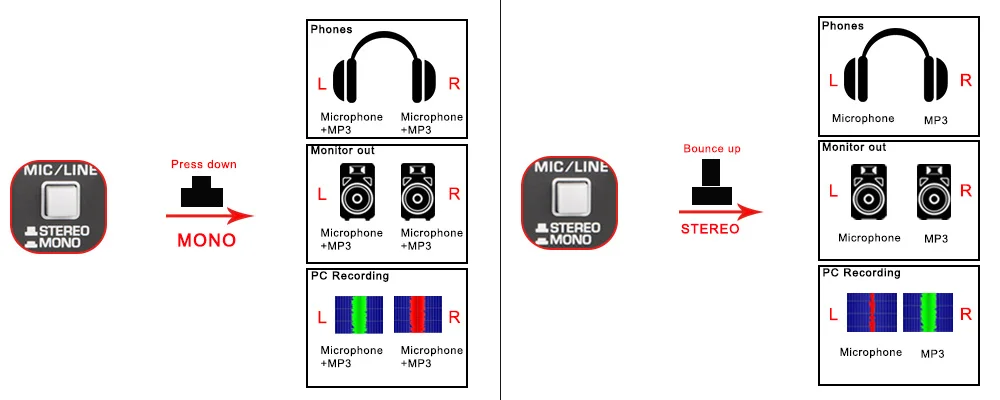 3.Cuando se presiona el botón, CH1 y CH2 se enviarán a L y R al mismo tiempo.