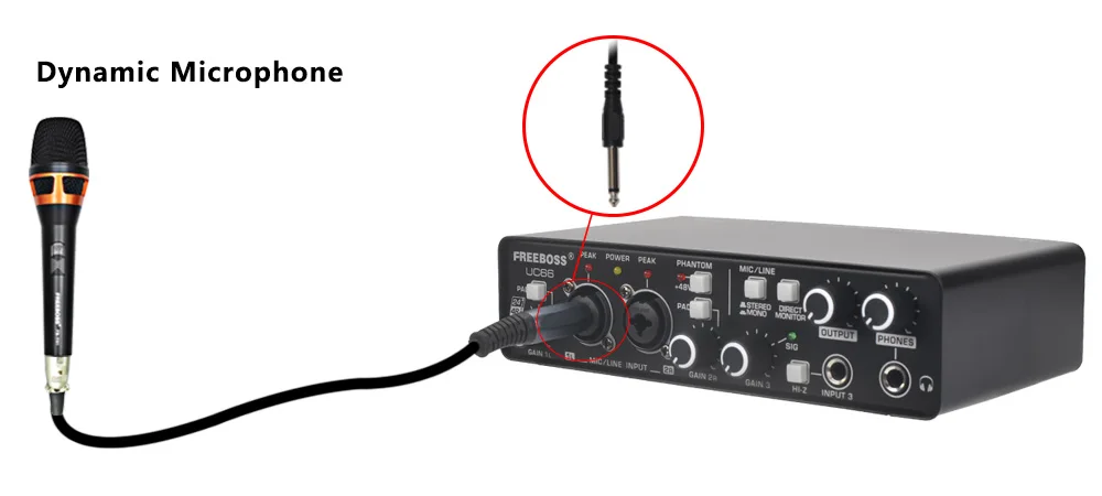 Si su micrófono es dinámico, le recomendamos utilizar un conector XLR para conectarse a la tarjeta de sonido, ya que el sonido será pequeño cuando utilice el conector 6.35 para conectarse a la tarjeta de sonido.