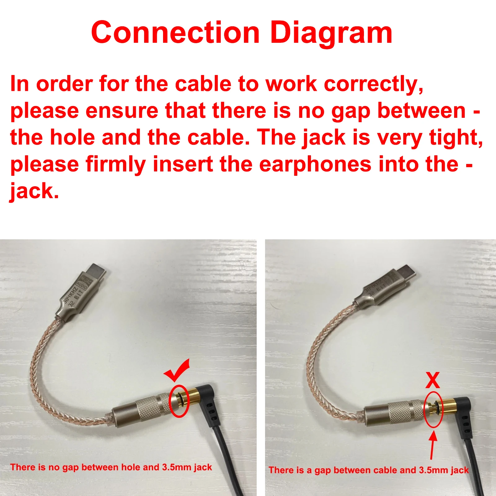 Para que el cable funcione correctamente, asegúrese de que no haya espacio entre el orificio y el cable. El conector está muy apretado, inserte firmemente los auriculares en el conector.