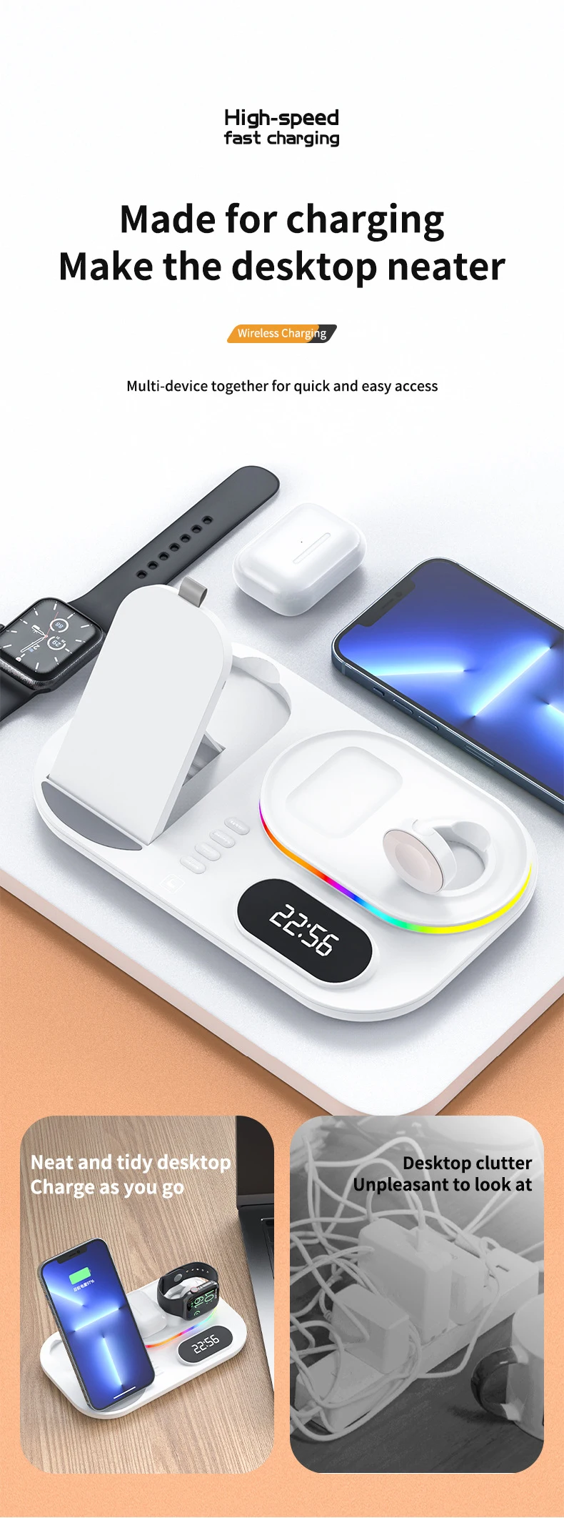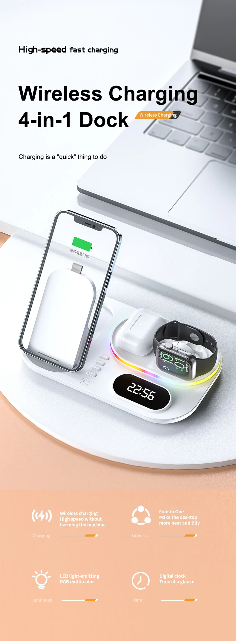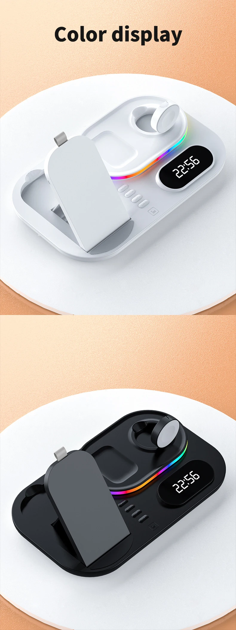 Interfaz de entrada tipo C 4 en 1 con reloj digital Materiales de alta calidad Estación de carga inalámbrica de estilo versátil de dos colores