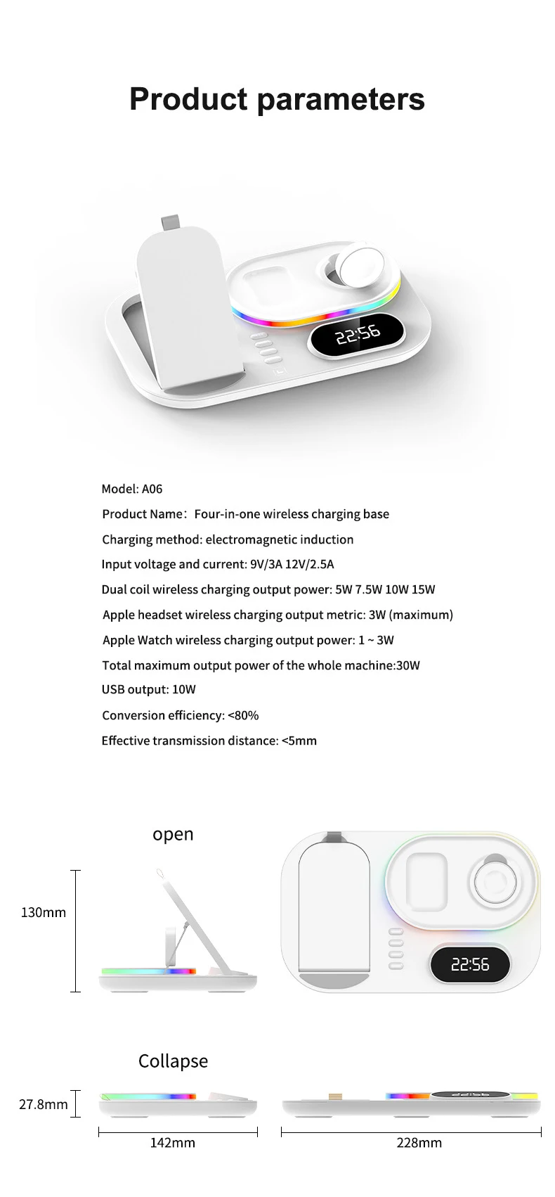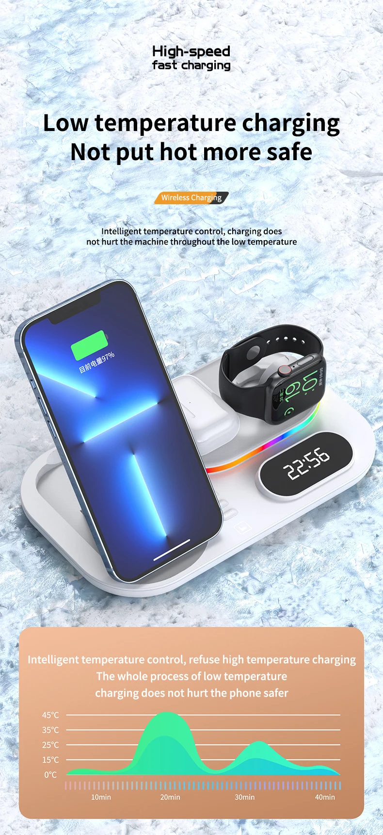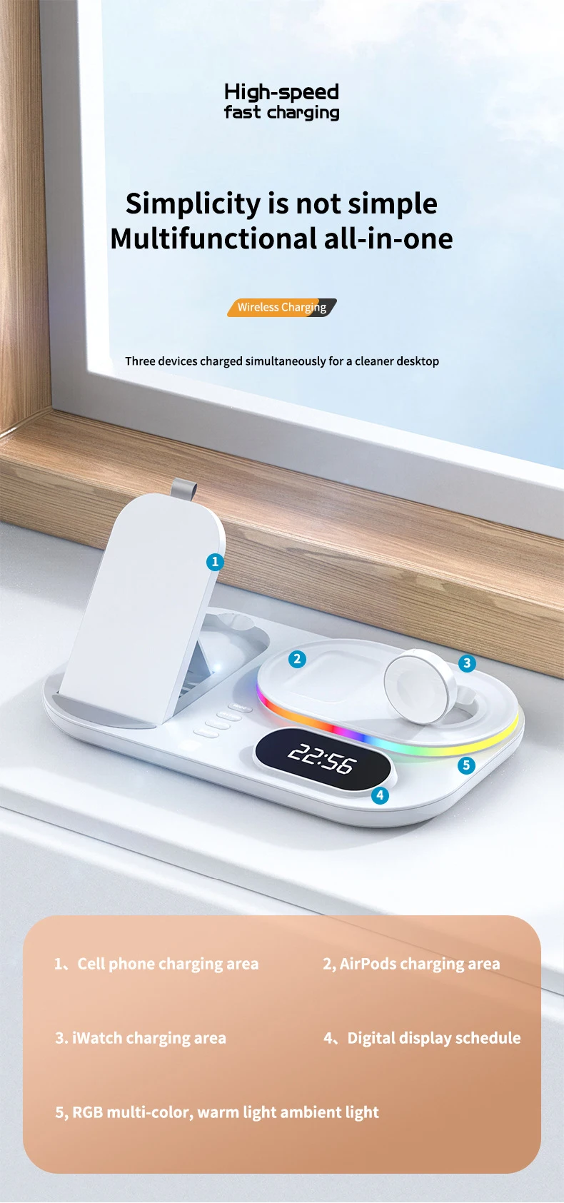 Interfaz de entrada tipo C 4 en 1 con reloj digital Materiales de alta calidad Estación de carga inalámbrica de estilo versátil de dos colores