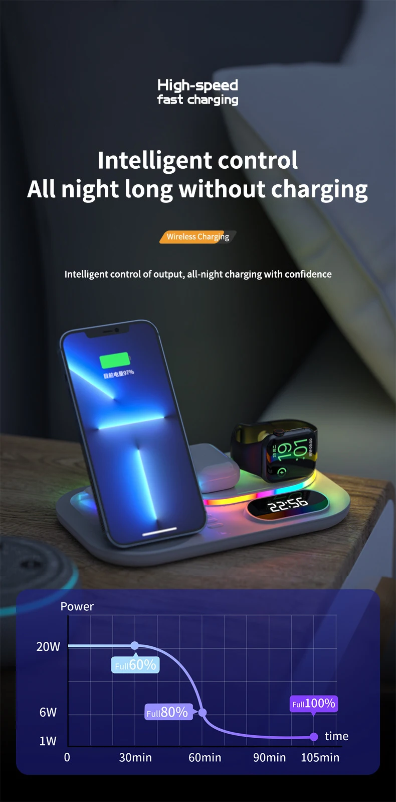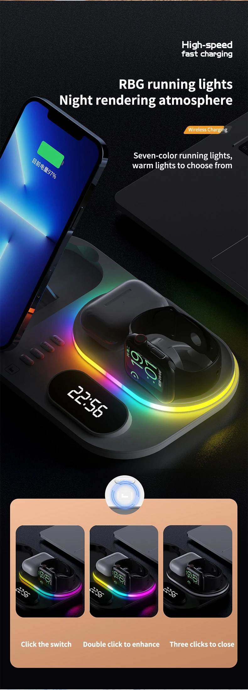 【Tres dispositivos cargando simultáneamente 】La estación de carga inalámbrica admite cargar sus cuatro dispositivos: teléfonos móviles, reloj, para airpods al mismo tiempo.