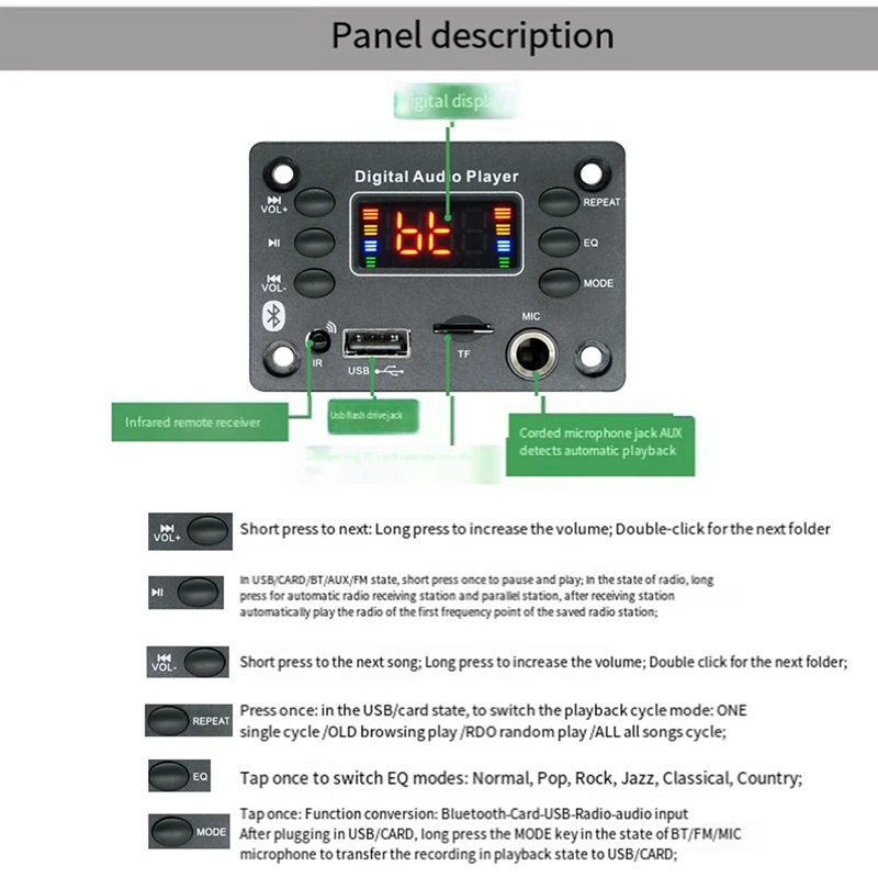 Introducción de la función: solución Zhongke Nanxun/función de soporte Bluetooth (versión Bluetooth 5,0)/potencia 2*25W/Interfaz de micrófono/función de grabación/decodificación dual de MP3, WMA, WAV, FLAC, música en formato APE sin pérdidas/lectura de disco USB/lectura de tarjeta TF/Radio FM/entrada de fuente de audio externa LINE IN/control remoto infrarrojo/Memoria de apagado/Fuente de alimentación de 12V (rango de voltaje 7V-16V);