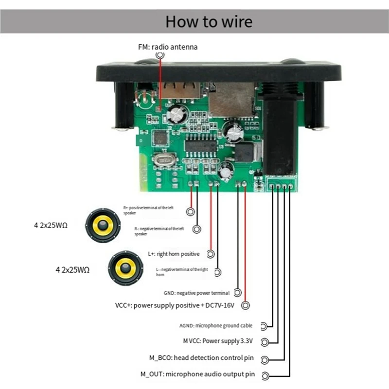 2. Potencia 2*25W, puede conectar dos altavoces de 25W al mismo tiempo, el tamaño de los altavoces no está limitado; Admite radio FM y banda de frecuencia (87,5 MHZ-108,0 MHZ);