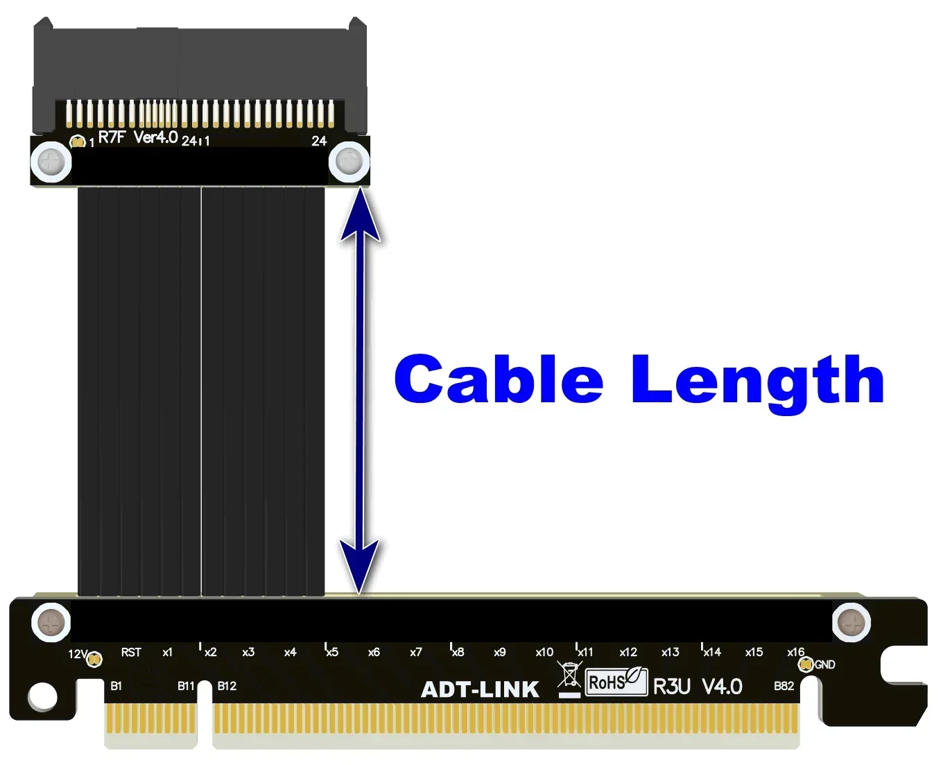 Número de piezaDescripciónAncho de bandaR37UF 4,0Extensión de cable PCIe x16 a U.2 Conector de 90 gradosPCIe 4,0x4 (64G/BPS)R37UL-TU 4,0Cable PCIe x16 a U.2, extensión de giro hacia abajo, Conector de 180 gradosPCIe 4,0x4 (64G/BPS)R37UF 4,0Extensión de cable PCIe x16 a U.2 Conector de 180 gradosPCIe 4,0x4 (64G/BPS)Descripción de la longitud del cable: