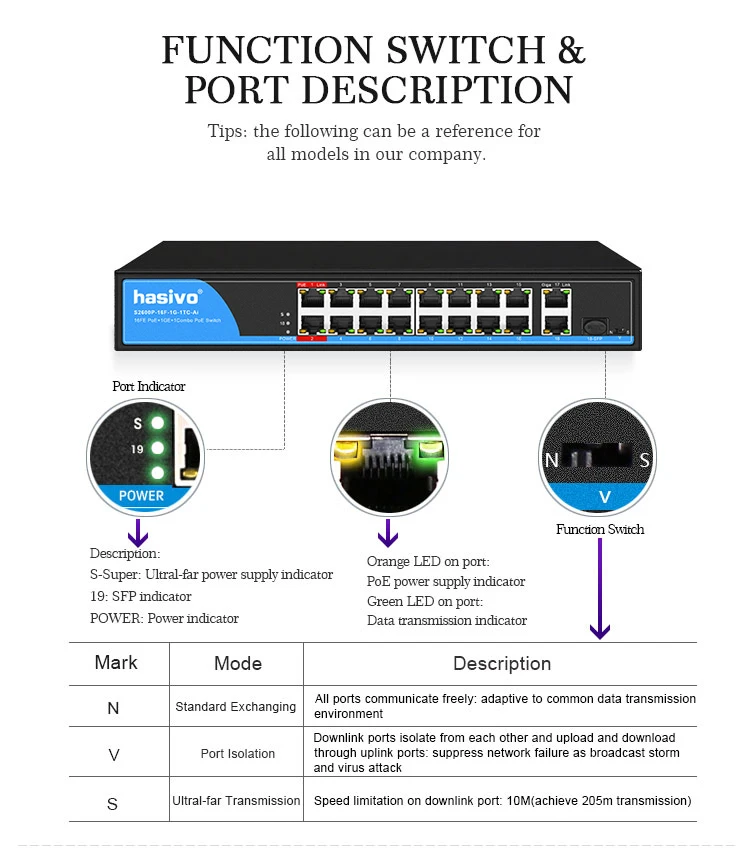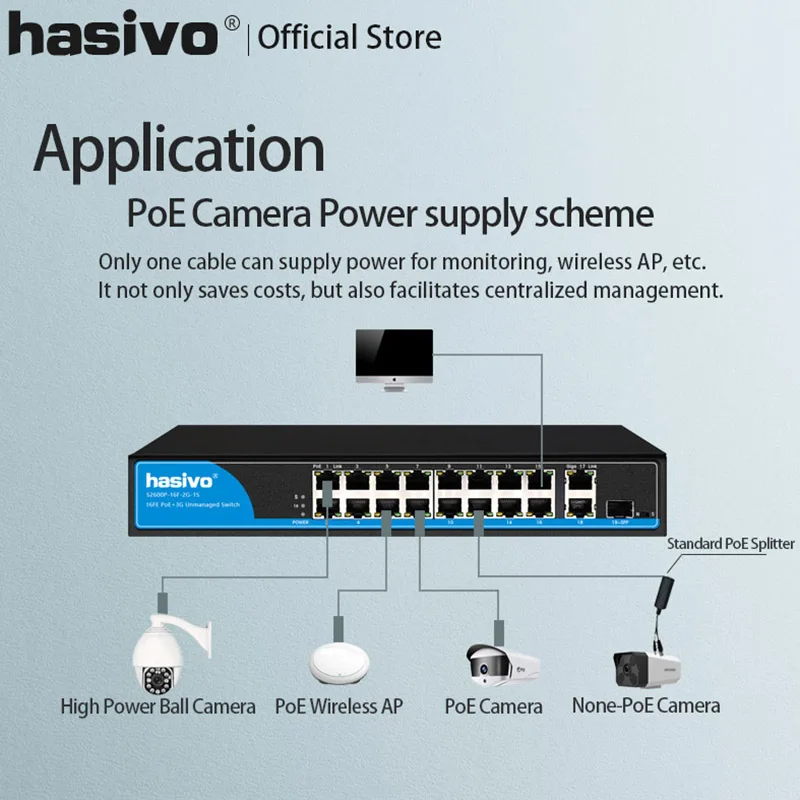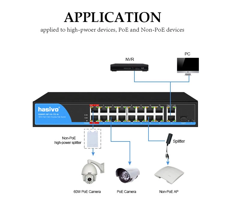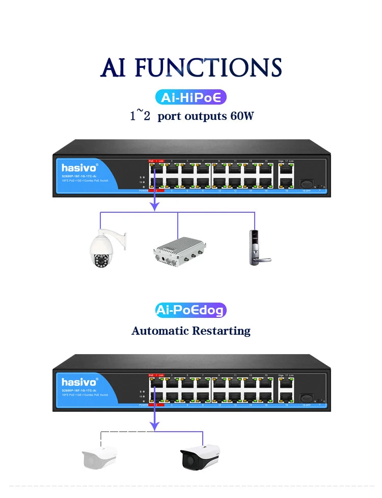 Detección y suministro automático de energía para dispositivos alimentados según IEEE 802. 3AF/AT PoE ++/HiPoE, conmutador PoE no gestionado hasivo (versión Ai) tiene nuevas funciones de HiPoE y PoEdog que pueden resolver de manera eficiente los problemas de suministro de energía de dispositivos de alta potencia como cámaras domo de alta potencia y punto de acceso inalámbrico AP y lograr la restauración automática cuando la máquina se rompe abajo. Del mismo modo, puede resolver los problemas que reinician la máquina anualmente en el acto y los requisitos de instalación en múltiples interruptores.