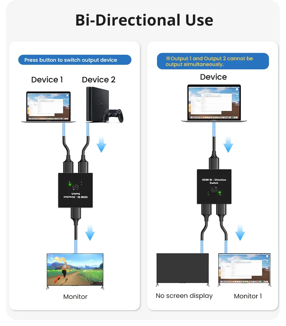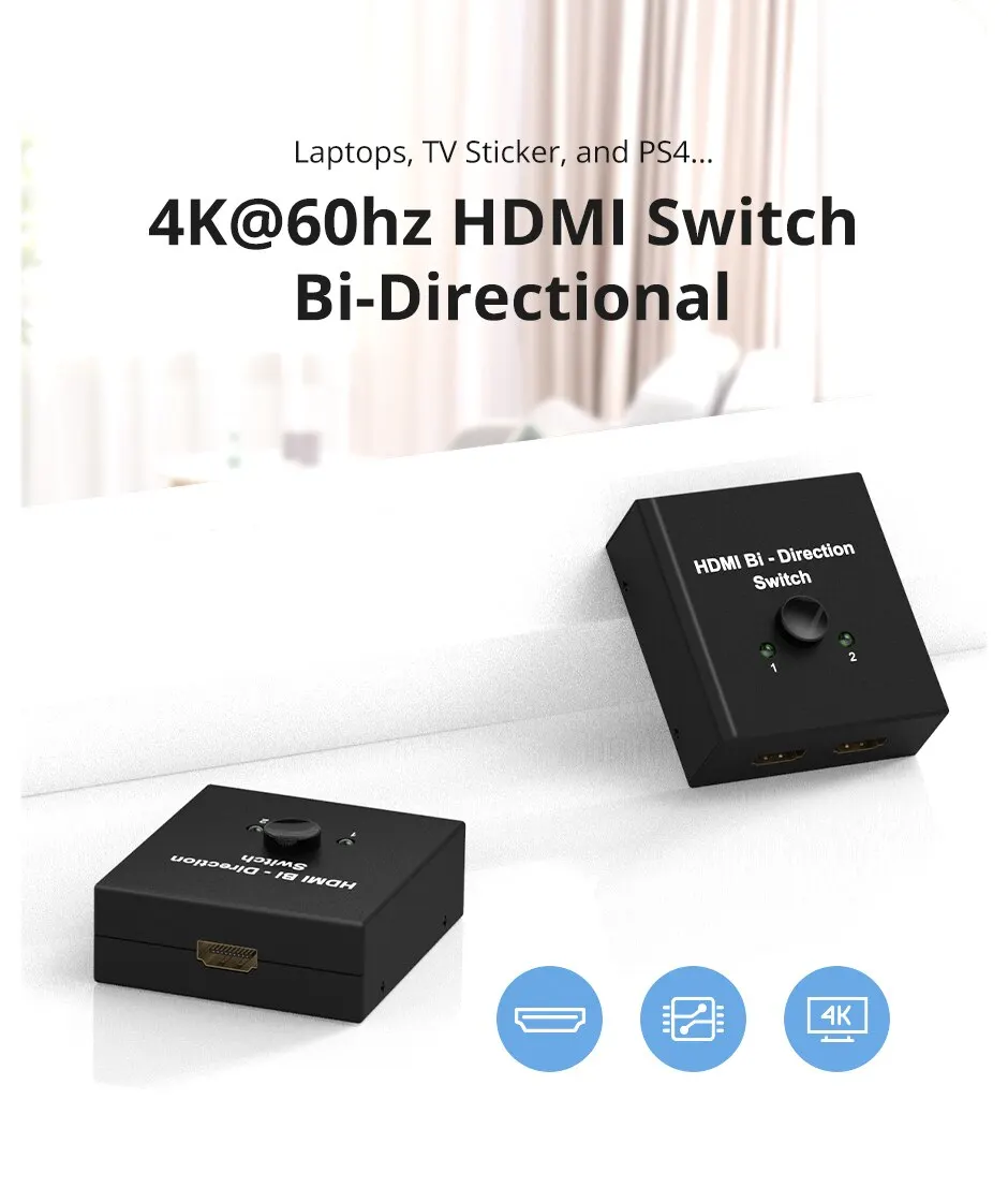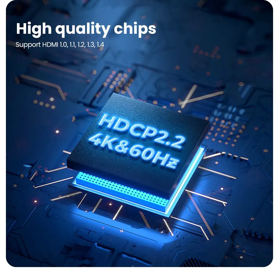 El conmutador HDMI admite ancho de banda de video de 18Gbps, entrada y salida AWG26 Longitud de cable estándar HDMI de hasta 5m. Sin lag, sin pérdida de calidad de imagen o sonido.