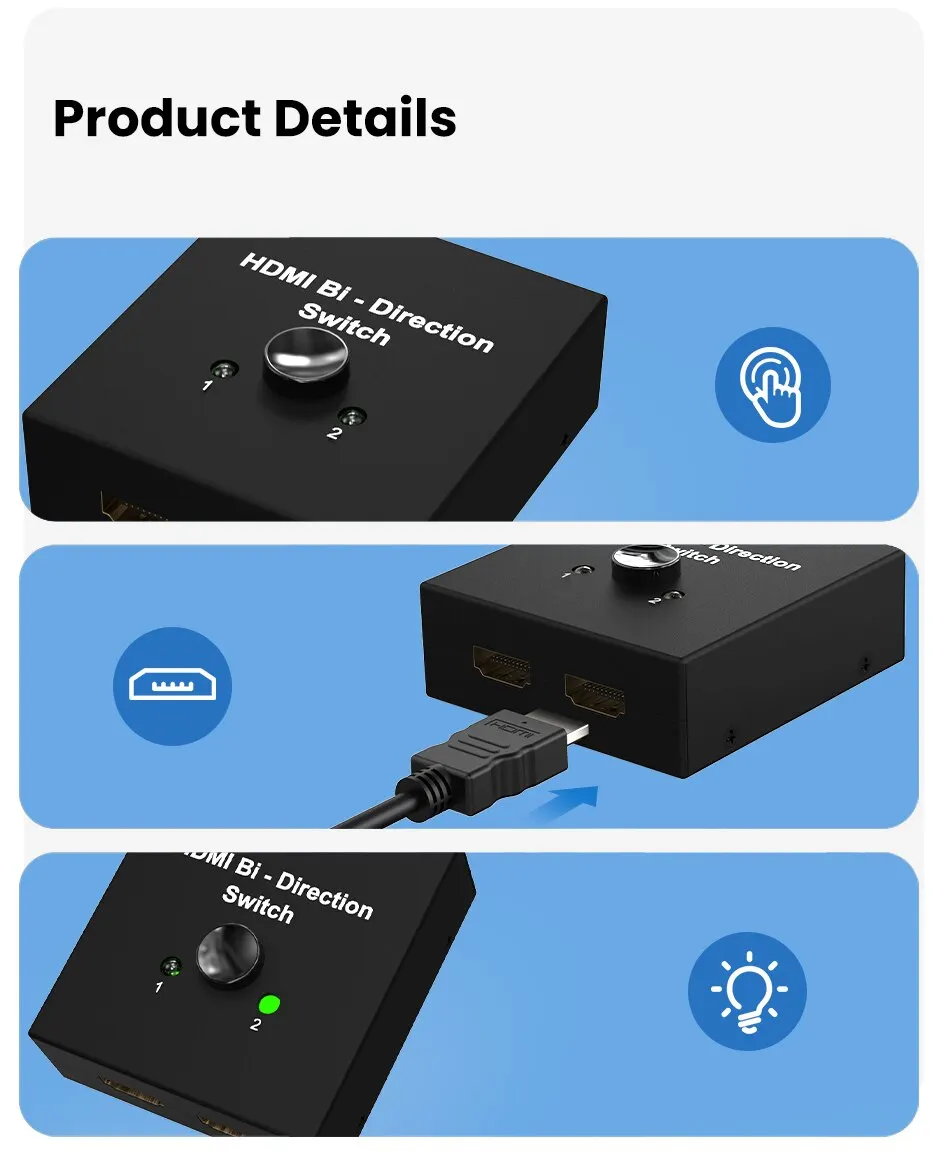 • Conector compatible con HDMI:El conector compatible con HDMI garantiza que el conmutador sea compatible con una amplia gama de dispositivos, lo que lo convierte en una adición versátil a su configuración.