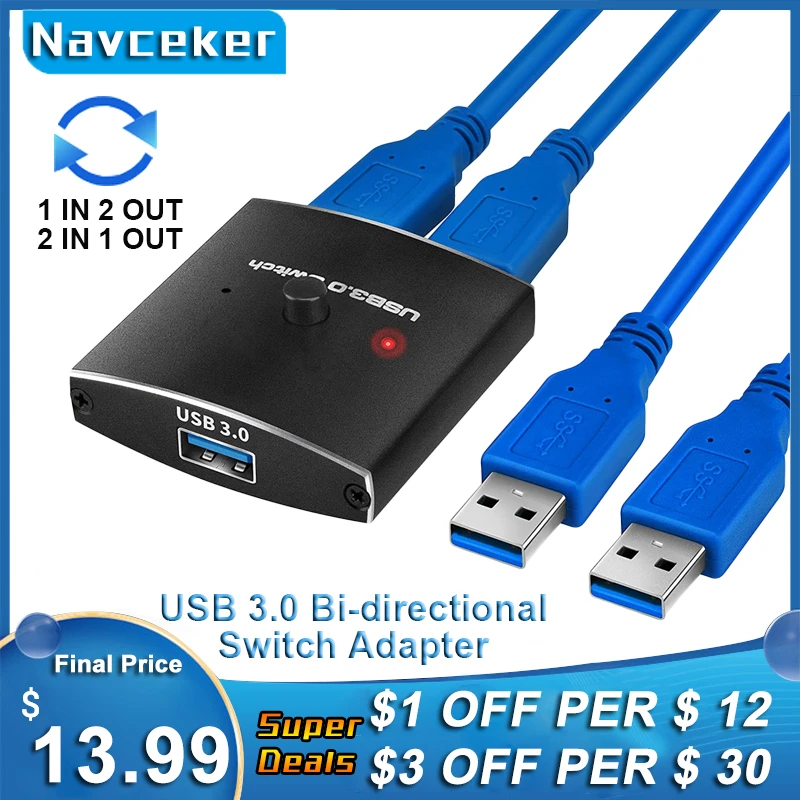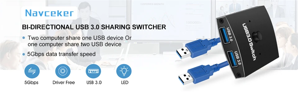 ZY-BU3,NavcekerEl interruptor para compartir USB3.0 puede permitir que dos ordenadores compartan 1 dispositivo USB o que un ordenador comparta 2 dispositivos USB. La velocidad de transferencia de datos PUEDE hasta 5 Gbps sin cambiar constantemente los cables o configurar un software complicado para compartir la red. Es ideal para usar en la oficina o en casa si necesita cambiar entre ordenadores. NOTA: SI QUIERES OBTENER UNA TASA DE TRANSFERENCIA DE DATOS DE 5 Gbps, ASEGÚRESE DE CONECTAR EL CABLE USB 3,0 Y EL DISPOSITIVO USB 3,0.