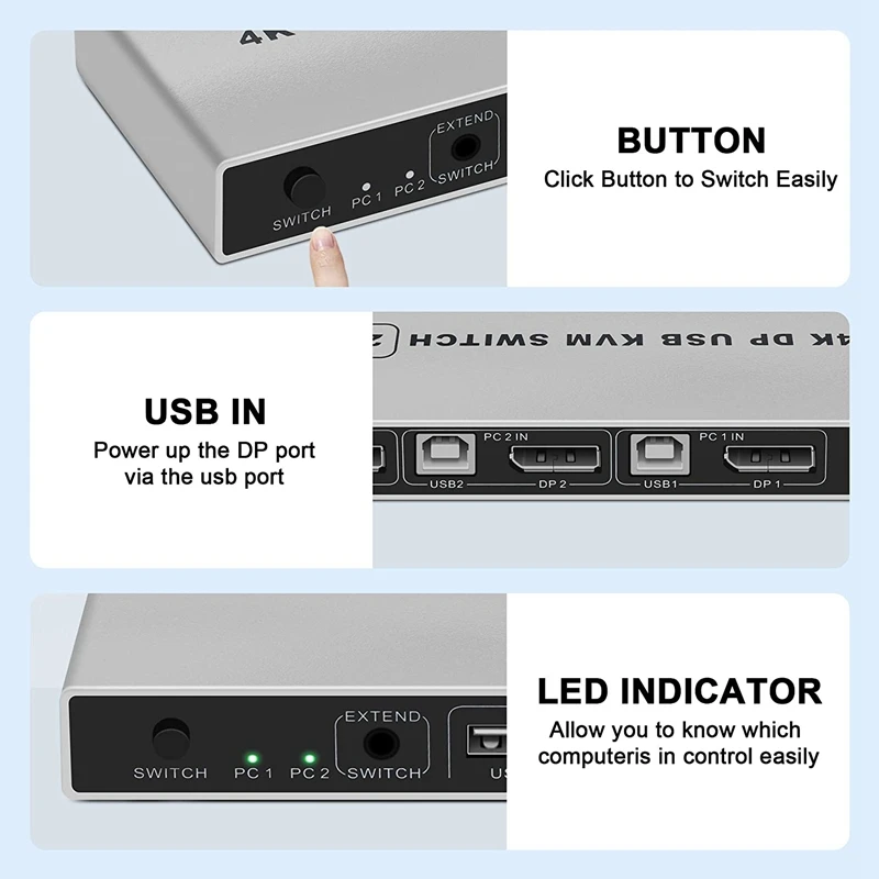 2. Características * Un conjunto de teclado y ratón USB para controlar 2 ordenadores DsplayPort para realizar la conmutación dos en uno libre y sincrónica; * Compatible con el estándar DisplayPort 1,4; * Adapte automáticamente EDID/HDCP para adaptarse a una variedad de entornos de aplicaciones complejas; * La resolución de la señal de vídeo de alta definición admite hasta 7680x4320 @ 60Hz, admite pantalla estéreo 3D Full HD de 120Hz, alta velocidad de fotogramas 240FPS,120FPS por ojo; * Puede conectar dispositivos USB de velocidad completa como: ratón USB, teclado, impresora, etc. * Puede usar el cable de extensión del botón o el interruptor de modo del botón host, conveniente y rápido; * Soporte multiplataforma para Windows,Linux y Mac; * Capacidad para identificar y configurar automáticamente varios modos de visualización; * Sistema de ecualización automática incorporado, la imagen es suave, clara y estable; * Circuito de protección estática ESD para proteger el sistema en todos los aspectos; * Fácil de instalar, enchufar y usar, sin necesidad de configurar;