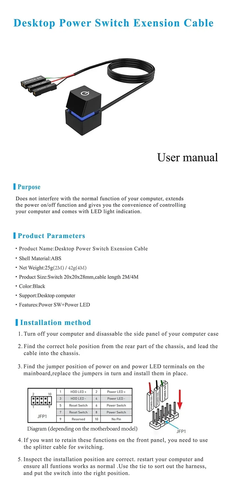 Interruptor de alimentación de ordenador de escritorio, placa base de PC, botón de encendido/apagado de arranque externo, Cable de extensión, botón pulsador, interruptor de escritorio