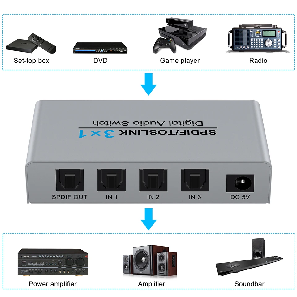 Este conmutador Toslink cambia tres señales de audio óptico digital SPDIF (Toslink) a una salida.Le permite conectar tres fuentes de audio ópticas individuales, como la salida de una consola de juegos o un reproductor de Blu-ray, a un dispositivo, como un televisor y un receptor AV, o un amplificador.Proporciona un audio limpio y preciso, sin distorsión ni interferencias de señal.Distancia de transmisión de hasta 40 m mediante cable de fibra óptica que pierde menos de 0,2 dB/m, frecuencia de muestreo de hasta 96 KHz