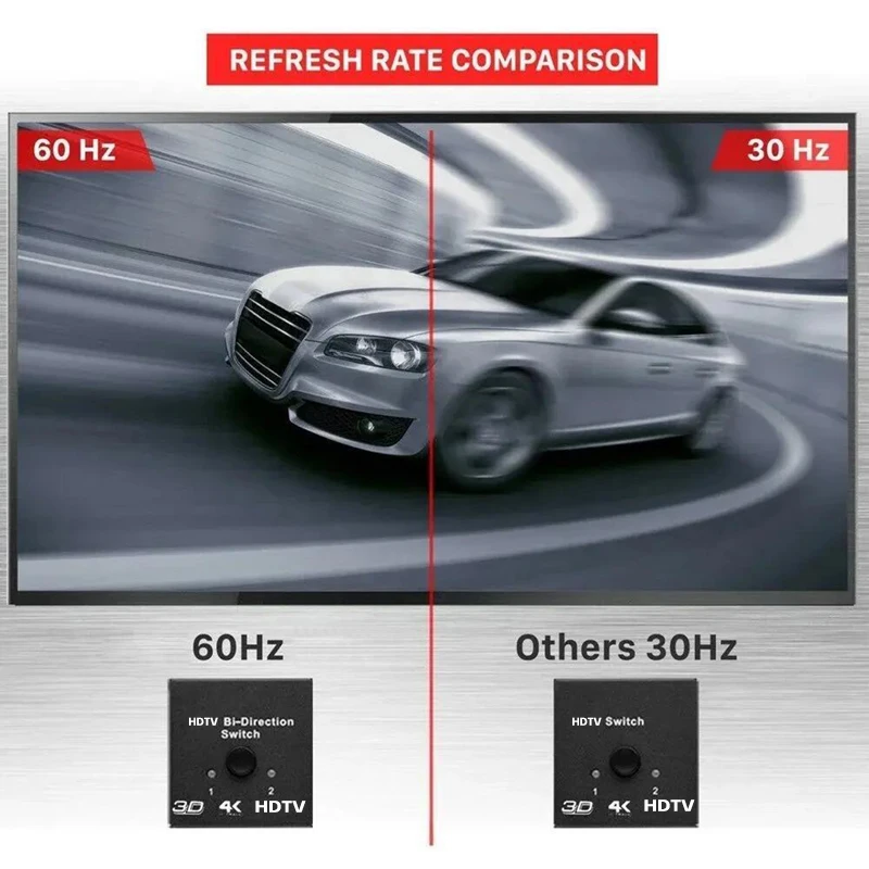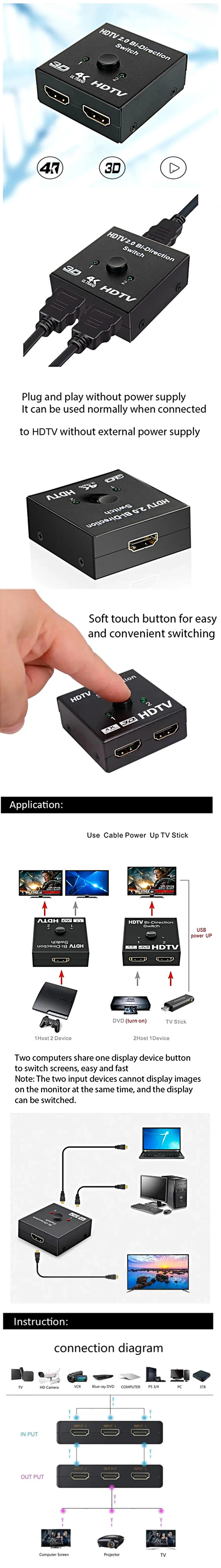 BI-DIRECTIONAL interruptor HDTV: la caja del interruptor HDTV puede hacer un trabajo bidireccional, ayudarle a conectar dos fuentes HDTV a una pantalla HDTV o conectar una fuente HDTV para alternar entre dos pantallas (2 televisores no pueden mostrar simultáneamente)