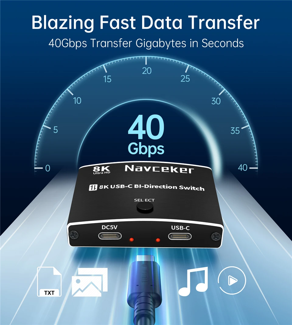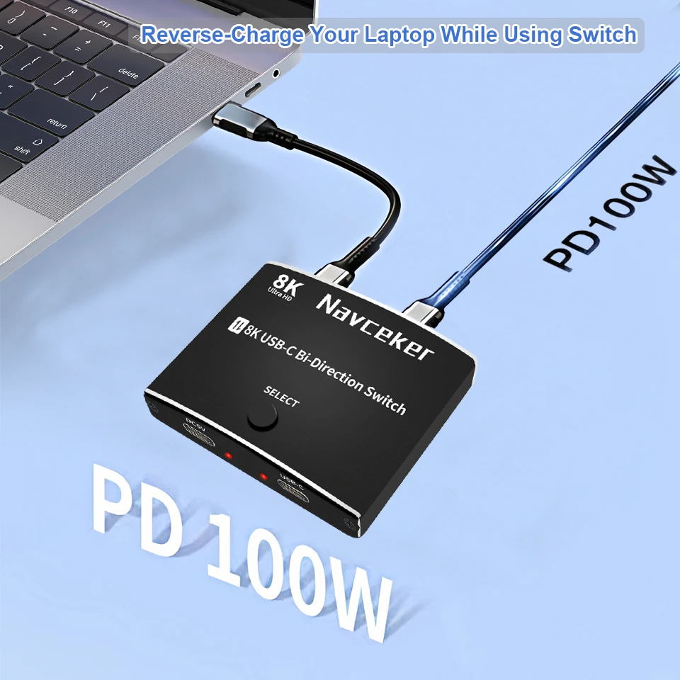 Navceker USB C Switch/Spliiter con transferencia de Video 8K, entrega de energía de 100W y datos de 40Gbps