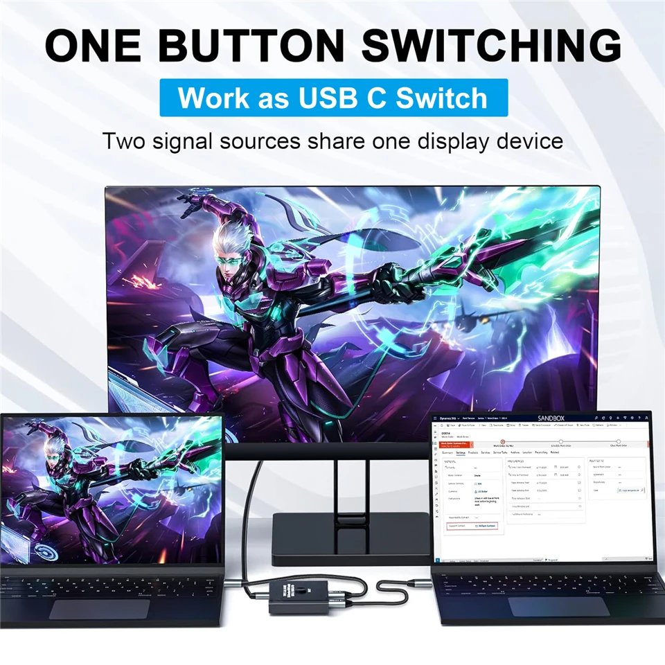 Funciona como un conmutador USB C, 2 fuentes de vídeo comparten 1 pantalla.