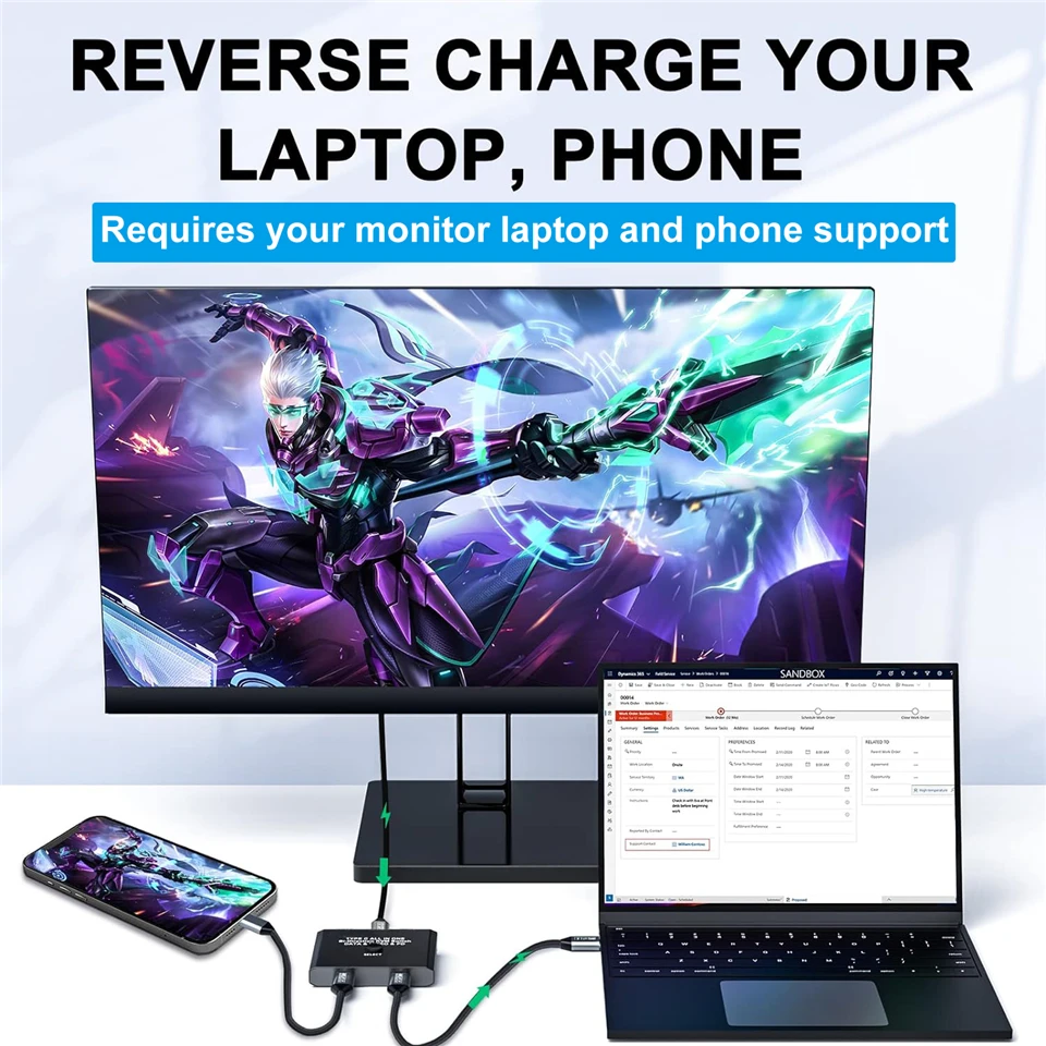 【Salida de vídeo 8K Ultra HD】Puede enviar un máximo de 8K a 60Hz, 4K a 120Hz, 1080P a 165Hz a través de nuestro interruptor/divisor USB C a sus pantallas o HDMI. Admite Salida de pantalla ultra ancha (3440x1440 @ 144Hz, etc.). La resolución máxima y la frecuencia de actualización de su salida dependen de su dispositivo fuente, monitor, base USB C y cables.