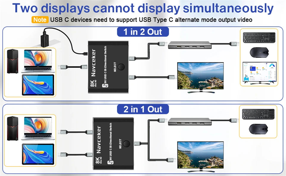 El interruptor Navceker 8K USB C permite conectar dos fuentes de USB-C, como un ordenador portátil, un Macbook, etc., a una sola pantalla de visualización de la USB-C. Además, también puede cambiar una fuente de señal a dos pantallas (al igual que el divisor 1*2, pero es diferente que las 2 pantallas no pueden funcionar al mismo tiempo).