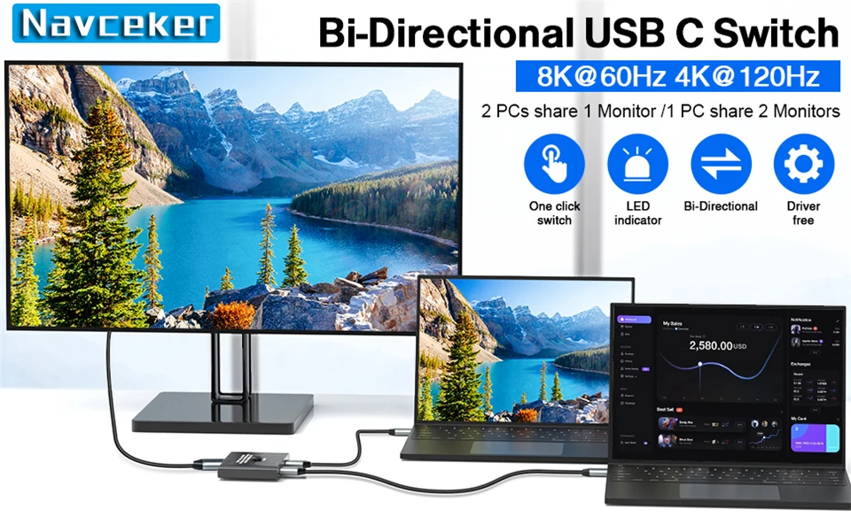 La resolución del interruptor Navceker USB C admite hasta 1080P @ 120/165Hz,2K @ 60/120/144Hz,4K @ 60/120Hz,8K @ 30/60Hz, retrocompatible.
