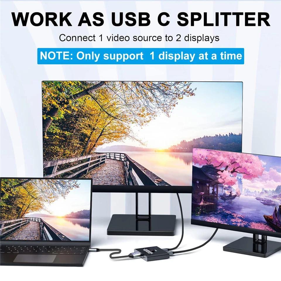 【Salida de vídeo 8K Ultra HD】Puede enviar un máximo de 8K a 60Hz, 4K a 120Hz, 1080P a 165Hz a través de nuestro interruptor/divisor USB C a sus pantallas o HDMI. Admite Salida de pantalla ultra ancha (3440*1440 @ 144Hz, etc.). La resolución máxima y la frecuencia de actualización de su salida dependen de su dispositivo de origen, monitor, base USB C y cables.