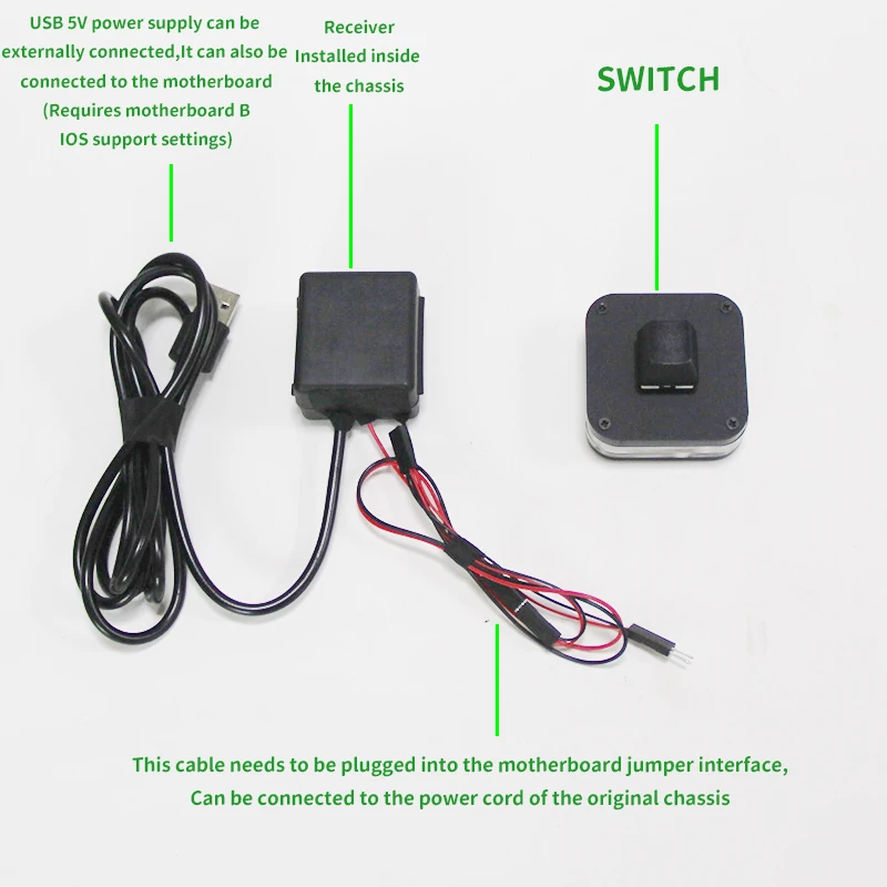 3. El Método de fuente de alimentación del receptor es USB, que se puede conectar a un cargador de 5V para fuente de alimentación o enchufar a la interfaz USB del host (la interfaz debe estar apagada, Y si no hay entrada de alimentación, debe configurarse en La BIOS. Las diferentes placas base tienen diferentes configuraciones, así que verifique el método de configuración en línea).