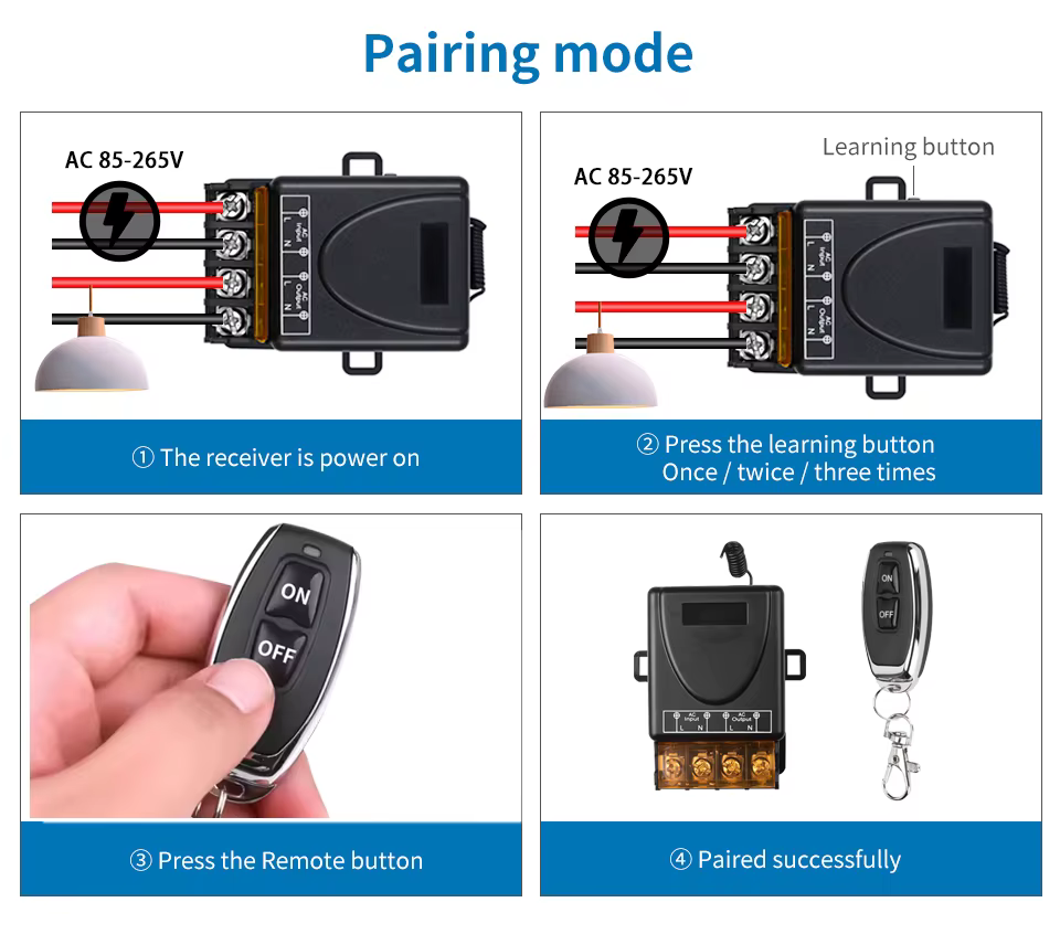 Alternar: presione el botón de aprendizaje 2 vez.El indicador LED parpadea 2 vez, luego presione el transmisor, el indicador LED parpadea 3 veces y aprende con éxito.