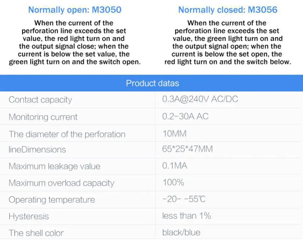 El rango de corriente monitoreada es de hasta 30 A; el umbral de monitoreo se puede ajustar entre 0,2-30 A.