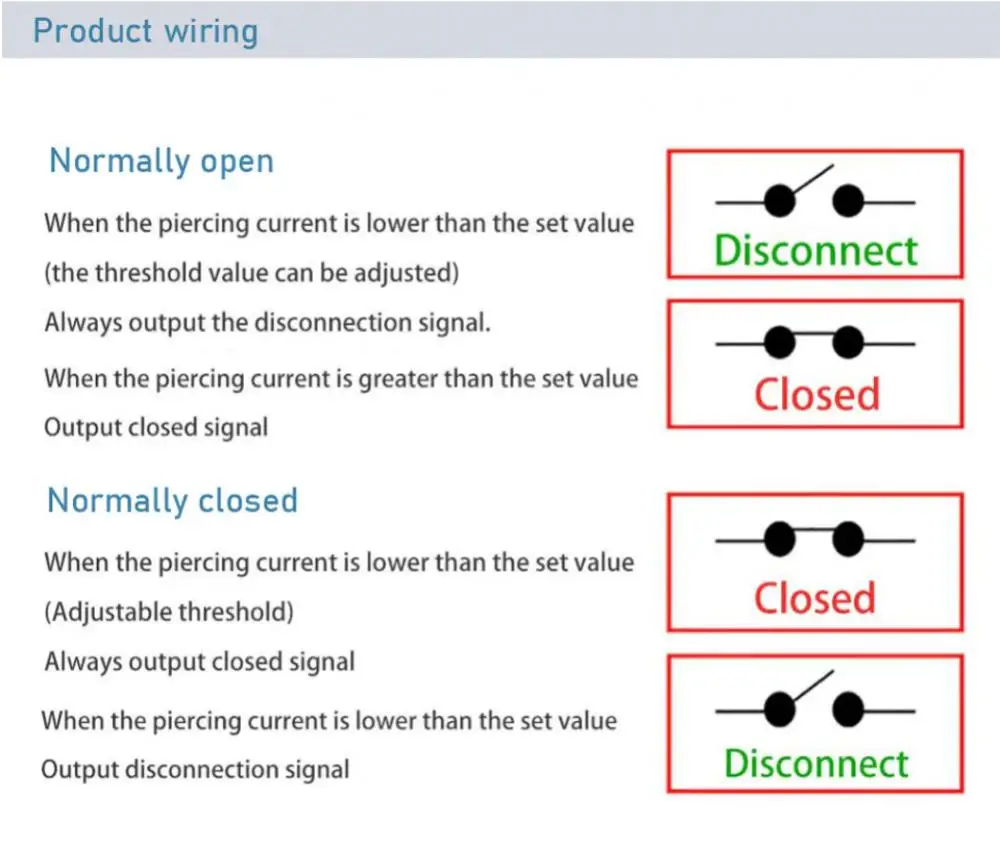Cuando la corriente de la línea de perforación excede el valor establecido, la luz roja se enciende y la señal de salida se cierra; cuando la corriente está por debajo del valor establecido, la luz verde se enciende y el interruptor se abre.