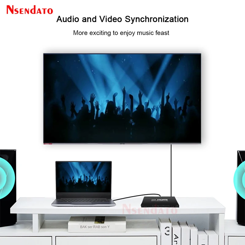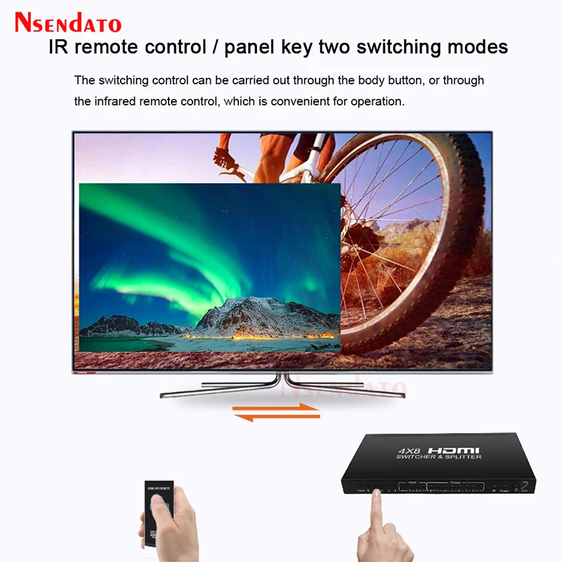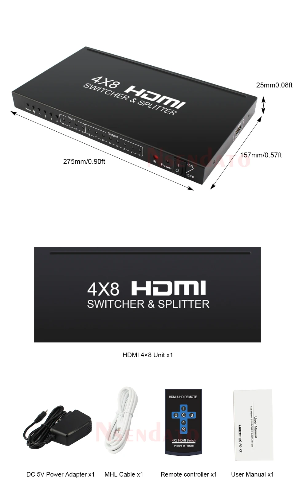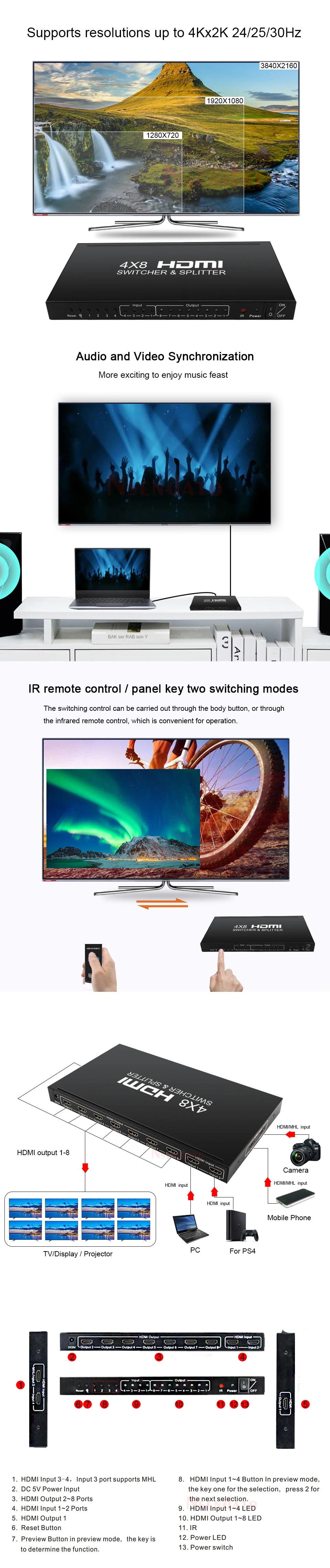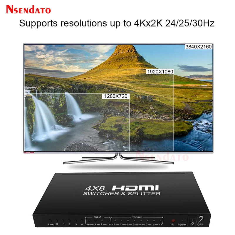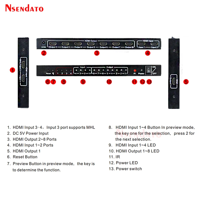 Aviso: Solo puede cambiar de las 4 entradas, elija 1 como señal de entrada, el total de 8 salidas mantiene el mismo.Por ejemplo: 4 entradas (A,B,C,D) cuando cambia A como señal de entrada, todas las 8 salidas aparecerán A.El producto Nsendto 4x8 HDMI permite el acceso a múltiples fuentes HDMI, un fregadero HDMI, puede distribuir la señal HDMI sin pérdidas a uno o más dispositivos displayterminal, el producto admite puerto HDMI que funciona en modo dual. 3 entradas HDMI y 8 puertos de salida HDMI. En este modo, el interruptor admite resoluciones de hasta 720p @ 60Hz,1080P @ 30Hz o en modo de píxeles empaquetados 1080p @ 60Hz. En modo HDMI, el producto admite resoluciones de hasta 4K x 2K 24/ 25/ 30Hz. El artículo también admite RAM EDID. El producto permite cambiar fácilmente 4 dispositivos HDMI a través de 8 monitores o proyectores compatibles con HDMI, cuando se introducen múltiples fuentes simultáneamente, admite vista previa de imagen y cambio rápido, para que se pierda lo maravilloso cada segundo. El producto también se puede colocar al final de un cable HDMI largo para regenerar la señal HDMI.Las especificacionesRango máximo de enlace único: 24/25/30fs/4K x 2KResolución HDMI: 24/50/60fs/1080p/1080i/720p/576p/576i/480p/480iAdmite formato de color de vídeo: 24 bits/color profundo 30 bits, 36 bitsRango de frecuencia Vertical: 60Hz @ 1080p;30Hz @ 4K x 2KAdmite formato de audio: Para dts-hd/dolby-truehd/LPCM7.1/DTS/dolby-ac3/DSDAncho de banda máximo: 340MHzVelocidad máxima de banda: 10,2 GbpsSeñal TMDS de entrada/salida: 0. 5 ~ 1 5 voltios p- p( TTL)Entrada/Salida DDC señal: p-p 5 voltios (TTL)1080P cable de entrada de distancia: ≤ 15m AWG26 cable HDMI estándar1080P cable de salida distancia: ≤ 20m AWG26 cable HDMI estándarDistancia del cable de entrada 4KX2K: ≤ 10m AWG24 HDMI cable estándarDistancia del cable de salida 4KX2K: ≤ 15m AWG24 HDMI cable estándarDe contenidoDivisor HDMI 4 × 8Adaptador de corriente DC 5VMando a distancia (sin batería en el interior)Manual de usuarioCable HD