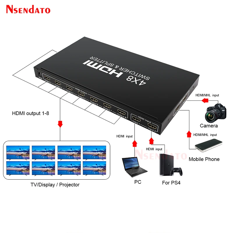 Comprar Interruptor divisor HDMI 4x8 4K HDMI 2,0, interruptor de velocidad, conmutador de Audio y vídeo 4 en 8, para PS4, PC, TV, Monitor y proyector