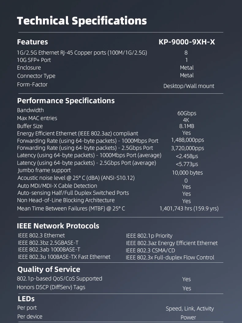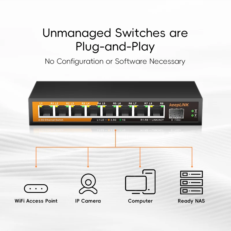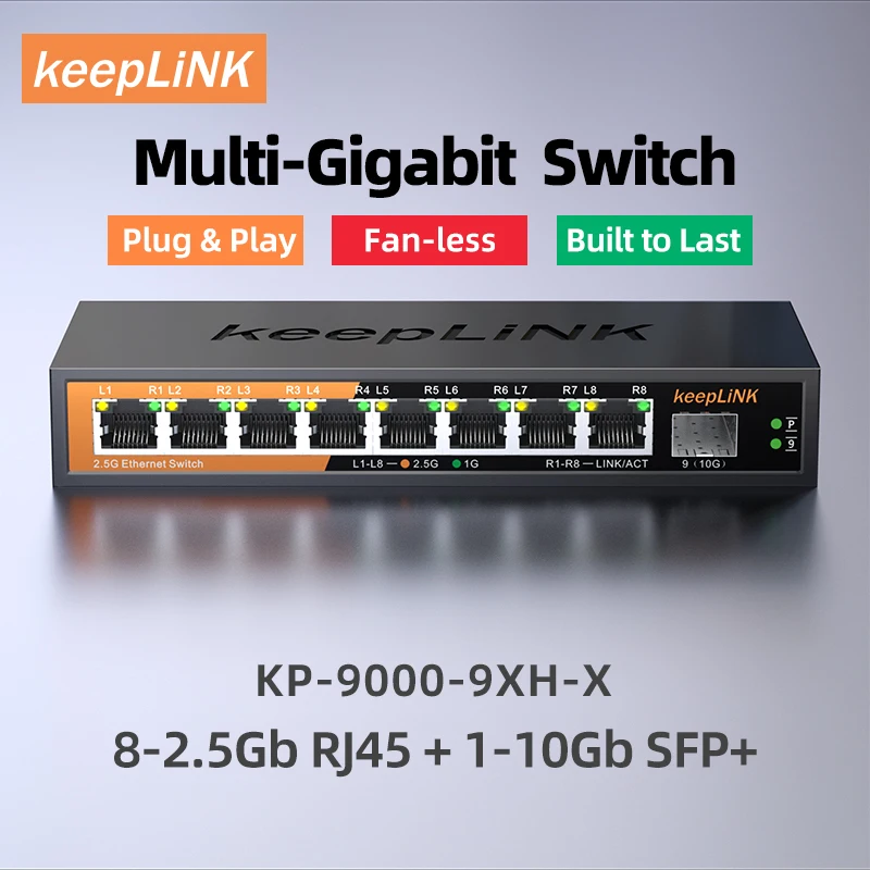 El conmutador no gestionado multigigabit de 8 puertos KeepLink, que se encuentra en el centro de la ciudad, ayuda a las empresas a expandir sus redes de manera rentable con velocidades de varios gigas. El conmutador Ethernet multigigabit de 2,5G viene con ocho (8) puertos G y uno (1). Puerto SFP + 10G en una caja de metal y se puede colocar en un escritorio o montar en una pared con el kit de montaje en pared incluido. Este interruptor es energéticamente eficiente, construido para durar y rigurosamente probado para proporcionar la fiabilidad que las empresas necesitan. La priorización de tráfico de 802,1 p y el soporte de tramas Jumbo permiten una integración perfecta con redes más sofisticadas.