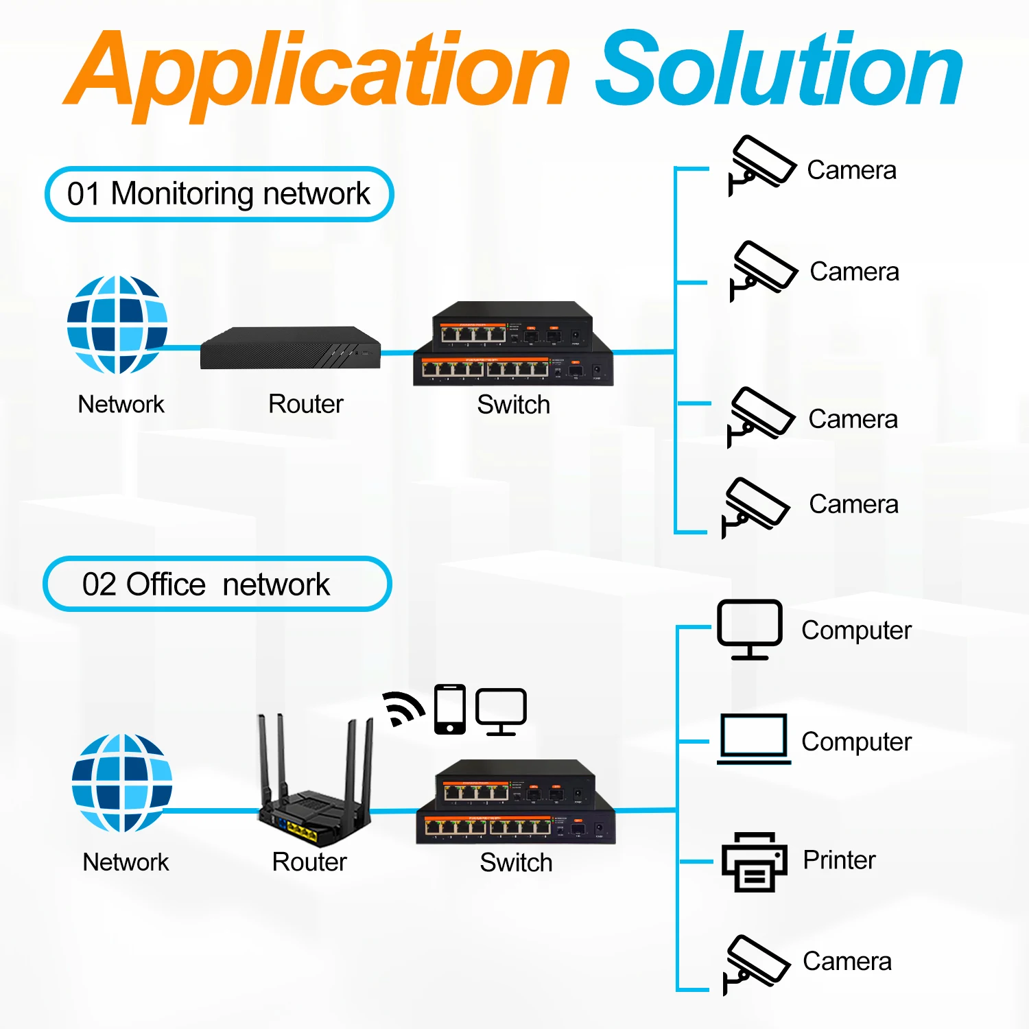 El conmutador cumple con los requisitos de fuente de alimentación de la red y es adecuado para la vigilancia IP y la coincidencia de dispositivos AP inalámbricos. Es ampliamente utilizado en centros comerciales, áreas residenciales, escuelas, hospitales, parques, hoteles, pequeñas y medianas empresas, etc.