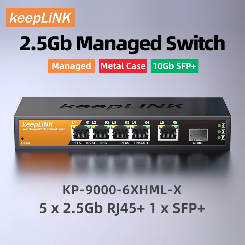 El conmutador gestionado multigigabit KeepLink de 5 puertos, por lo que ayuda a las empresas a expandir sus redes de manera rentable con velocidades de varios gigas. El conmutador Ethernet multigigabit de la serie "Multi-Gigabit" viene con cinco (5) puertos 2,5G y uno (1). Puerto SFP + 10G en una caja de metal y se puede colocar en un escritorio o montar en una pared con el kit de montaje en pared incluido. Este interruptor es energéticamente eficiente, construido para durar y rigurosamente probado para proporcionar la fiabilidad que las empresas necesitan. La priorización de tráfico de 802,1 p y el soporte de tramas Jumbo permiten una integración perfecta con redes más sofisticadas.