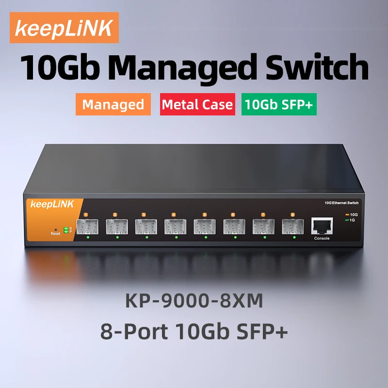 El conmutador gestionado multigigabit de 8 puertos KeepLink, que ayuda a las empresas a ampliar de forma rentable sus redes con velocidades de varios gigas. El conmutador Ethernet multigigabit de dos vías (1) viene con ocho (8) puertos SFP + de 10Gb y un (2) puerto de la consola en una caja de metal y se puede colocar en un escritorio o montar en una pared con el kit de montaje en pared incluido. Este interruptor es energéticamente eficiente, construido para durar y rigurosamente probado para proporcionar la fiabilidad que las empresas necesitan. La priorización de tráfico de 802,1 p y el soporte de tramas Jumbo permiten una integración perfecta con redes más sofisticadas.